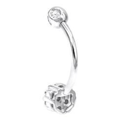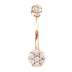 This luxurious 14K gold belly button ring with diamonds totaling half a carat features sparkling bezel and prong set round diamonds arranged in a unique flower or cluster design. This diamond belly ring is available in 14K white, yellow, or rose gold and can be customized with different fancy color diamonds.