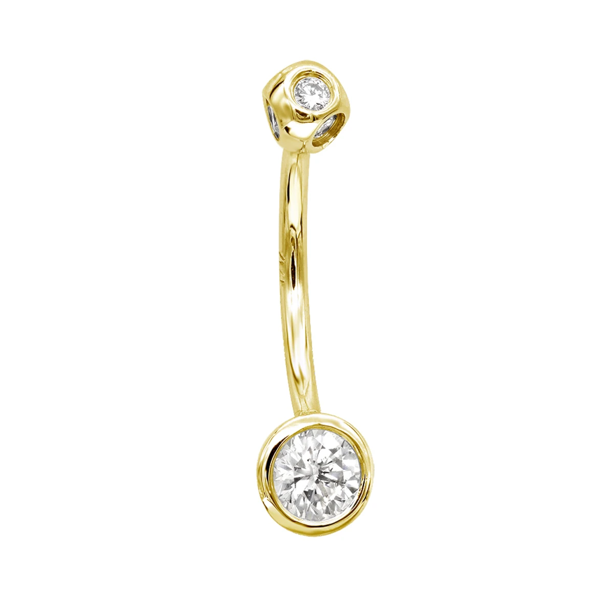 This luxurious 14K gold and diamond belly button peircing ring features 0.66 ctw of sparkling round diamonds, with the spotlight on the solitaire round diamond expertly bezel set in highly polished gold. This diamond belly button piercing ring is available in 14K white, yellow, or rose gold and can be customized with different fancy color diamonds.