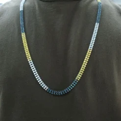 From our diamond chains for men collection This colorful and luxurious 14K Gold Men’s Diamond Chain with a two row tennis necklace design is immense in its weight, and even more impressive in its one-of-a-kind luster. Featuring of sparkling white, yellow and blue round diamonds, each expertly prong set in a 3-row gold frame, this dazzling men’s diamond chain is available in 14K white, yellow and red gold. This men’s color diamond chain comes in any length and diamond or gemstones combination, and can also be made with more than 2 rows of diamonds. Please contact us if you would like to customize this chain!