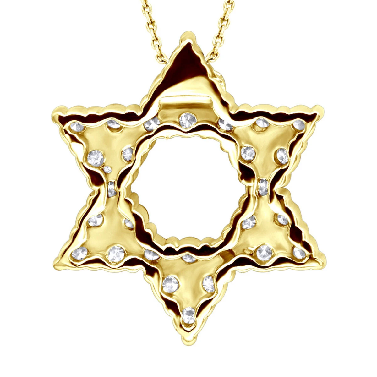 Luxurman Jewish Jewelry Collection: this classic diamond Star of David Necklace is made from solid 14k gold and paved in beautiful and sparkling natural round diamonds totaling 0.65 carat; pendant is about 3/4 inches wide (20mm) and includes matching 18 inch long 14k gold chain. The Star of David, known in Hebrew as the Shield of David or Magen David, is a generally recognized symbol of modern Jewish identity and Judaism, of a hexagram shape, composed of two equilateral triangles. Availalbe in 14k white gold yellow gold, rose gold as well as 18k gold and platinum as a custom order, this pave diamond Star of David Necklace makes an ideal bat mitzvah, birthday, or holiday gift. You also can personalize this piece or check we’ve already made and create your own design.