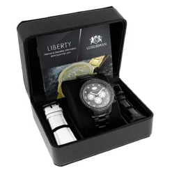 This 2 Carat Black Diamond Bezel Watch for Men by Luxurman showcases 2 carats of sparkling round diamonds. Features a black dial with three subdials and a black tone stainless steel band. This luxurious men’s diamond watch by Luxurman houses a fine Swiss-made quartz movement and comes with two interchangeable straps in different colors (band colors may vary).