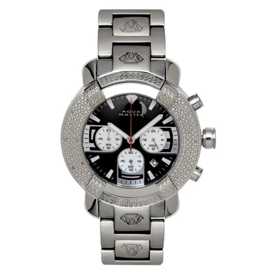 Diamond Aqua Master Watches! This Stainless Steel Men’s Diamond Watch by Aqua Master features 20 round diamonds, a black face with 3 white chronograph subdials, a polished stainless steel case and a stainless steel band. This versatile men’s diamond Aqua Master watch for men showcases a professional chronograph movement and is water-resistant to 150 FT.