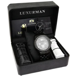 Trendy and Affordable Black Diamond Watches: This Luxurman Men’s Watch features 2.25 carats of sparkling black diamonds on the bezel of the black tone stainless steel case. This Luxurman diamond watch showcases a dial paved in white stones with Date/Calendar/24 hours white mother of pearl subdials and a black tone stainless steel band. This diamond watch by Luxurman comes with two interchangeable straps in different colors and makes a perfect present for any occasion.