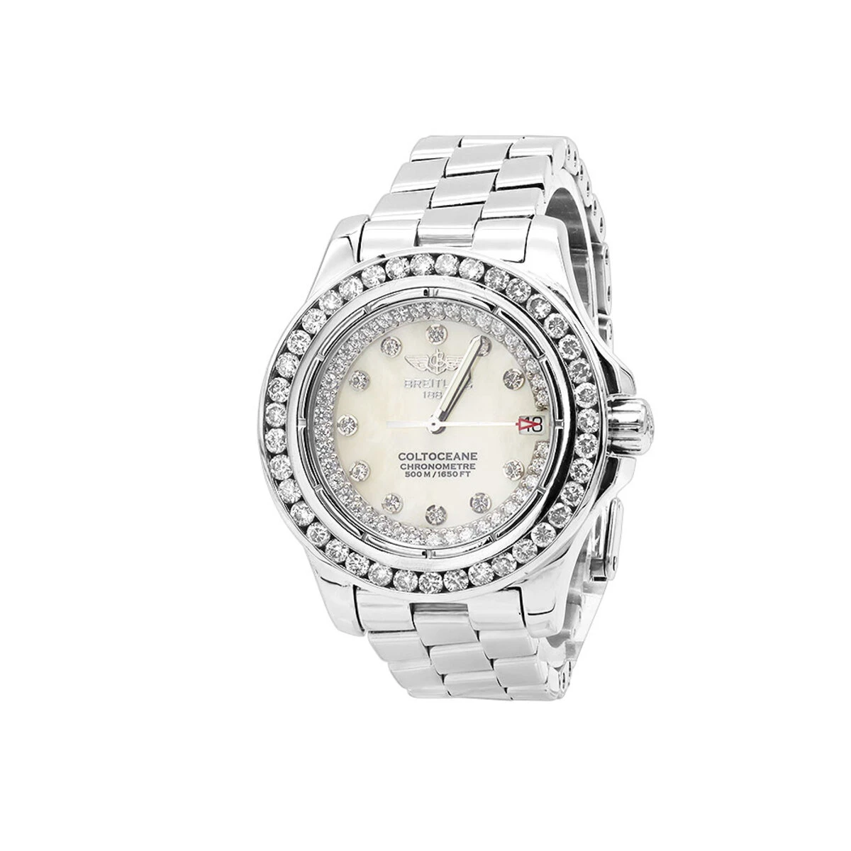 This custom Breitling diamond watch for women is perfect for any occasion, from a night out on the town to a formal event. The stainless steel case and bracelet are both durable and stylish, and the diamond bezel and markers add a touch of elegance and sophistication. The Breitling Colt Ocean Diamond Watch is a luxurious and unique timepiece that is sure to make a statement.