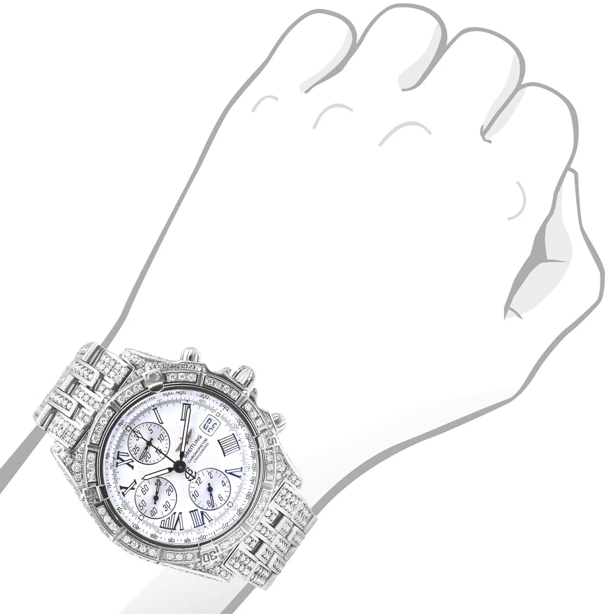 This Diamond Breitling Crosswind watch for men is an exquisite timepiece that is sure to turn heads. Featuring a stainless steel case with a silver color, this Men’s Diamond Breitling watch is adorned with 12.09 ct of diamonds on the bezel and case. The bezel is made of stainless steel and is set with white diamonds, while the case, lugs, and sides are set with white diamonds for a luxurious look. The dial is white with black Roman numerals and hands and is protected by a scratch-resistant sapphire-coated window. The watch is powered by an automatic movement and is water resistant up to 100 meters.