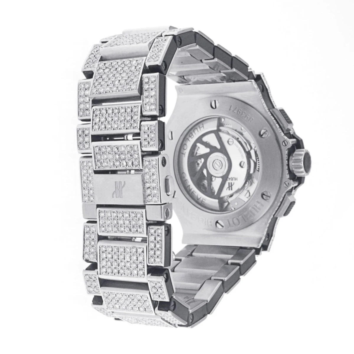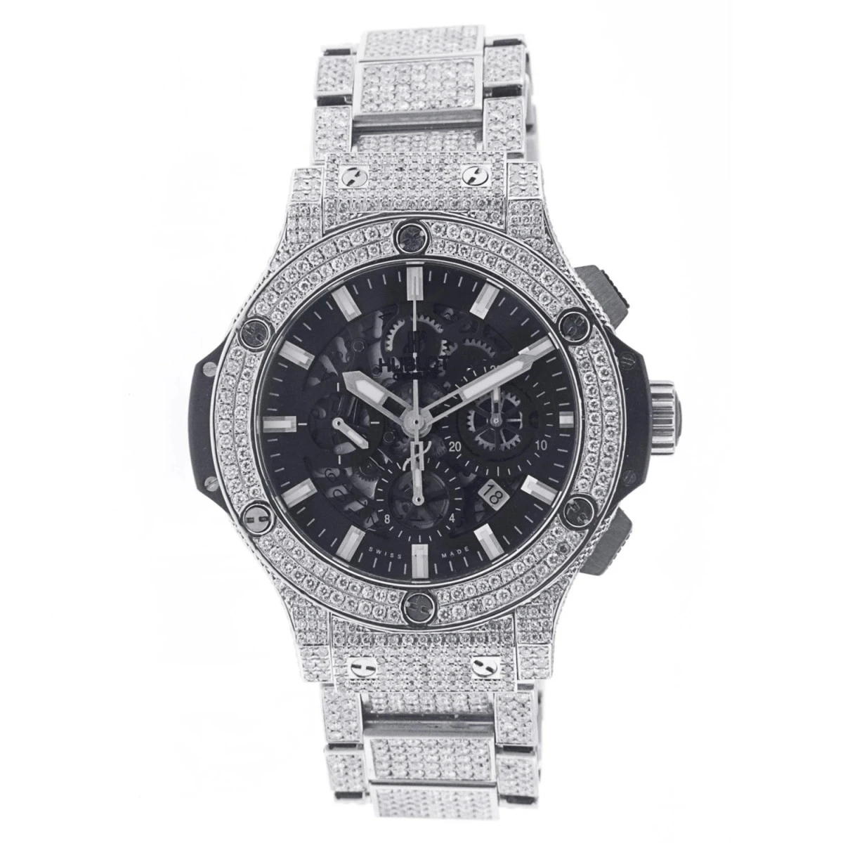 From our men’s diamond watches collection This outstanding Bust Down Hublot watch is a popular Big Bang Aero Watch 311.sx.1170.sx with a 44mm case, the watch and can be confidently worn without any need for further jewels due to it’s eye-catching, attention commanding style. This one of a kind timepiece is featuring a very masculine design with an iced out stainless steel bracelet, an incrusted from all sides bezel and a breathtaking skeleton see-through dial. This watch has an industrial and at the same time very lavish look being fully covered in radiant naturally mined white round diamonds. The remarkable black dial also showcases 3 subdials and a convenient date display. This Hublot men’s watch is water resistant to up to 100 meters. Please note: this original Hublot men’s watch is pre-owned, in like new condition and comes in an original box with a 5 year warranty from ItsHot.com.