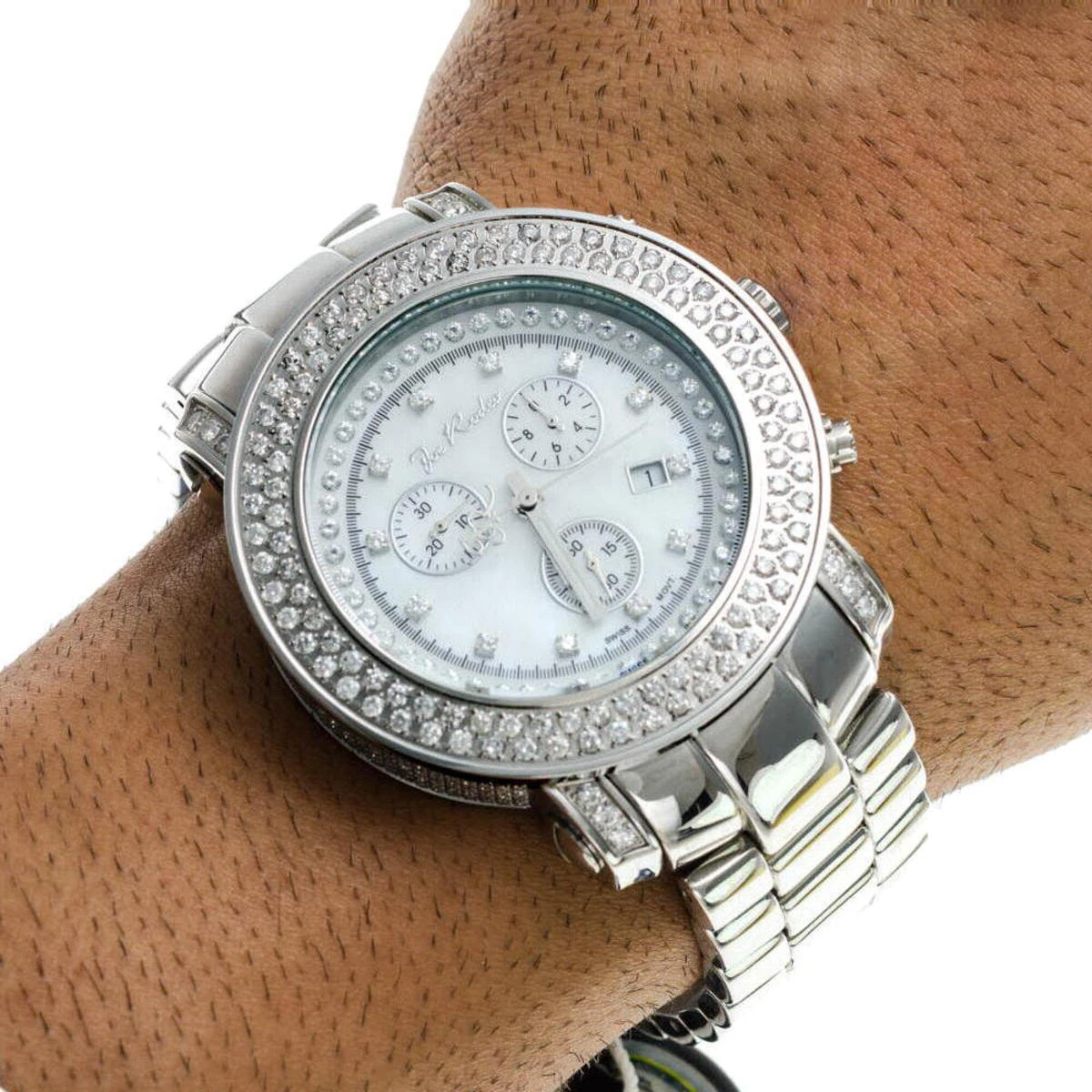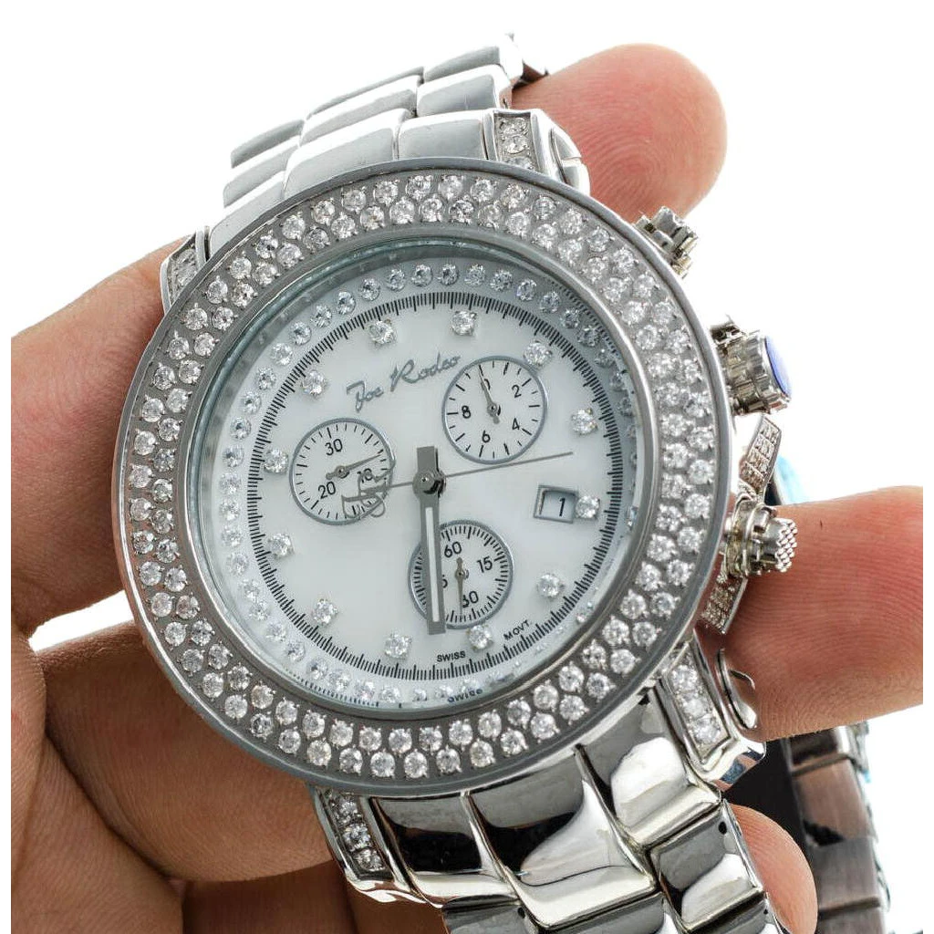 This diamond JoJo Watch (Iced Out Joe Rodeo Junior) features 6.75 carats of diamonds, a polished Silver stainless steel case with glowing diamonds on the lugs and sides, two rows of incredible diamonds on the bezel, scratch-free crystal glass, individually numbered and engraved stainless steel case-back. White Mother of Pearl face with glistening white stones around and as hour markers. Silver Stainless Steel band. Fine Swiss-made quartz movement. This iced out diamond watch by Joe Rodeo is water-resistant to 100 m (330 ft).