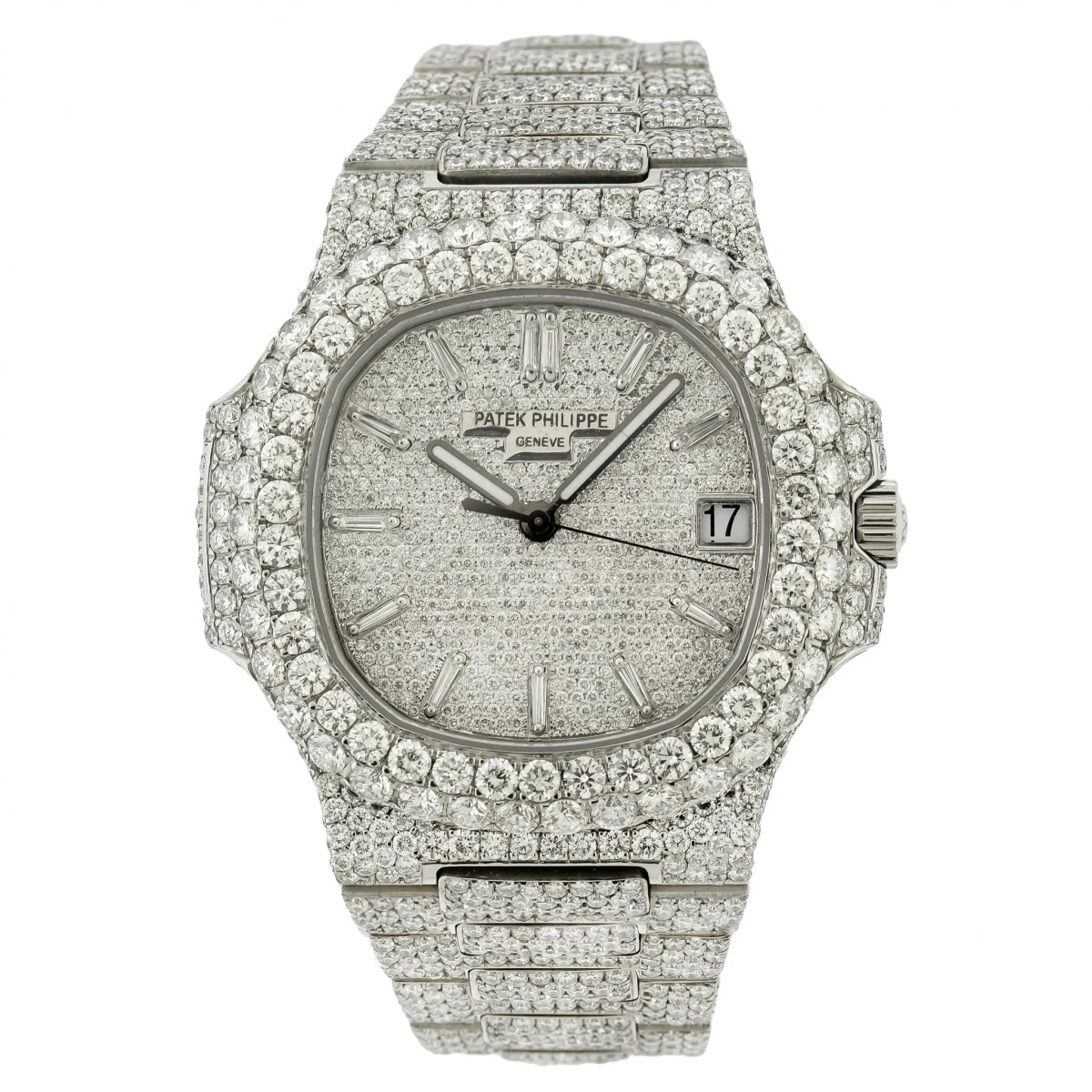 From our men’s diamond watches collection: This Fully Iced Out Patek Philippe Nautilus Real Diamond Watch for Men 5711/1has a 40mm case and is fully paved with 31.5 carats of of diamonds, this dazzling watch just couldn’t accommodate any more precious diamonds than it already has! The peerless beauty of it’s scintillating dial, bezel, sides and bracelet make a mesmerising timepiece and create striking constellations of light. Even though the dial is fully iced out with round diamonds, the hour markers are also made of diamonds, the baguette cut ones! It also features a date window positioned at three o’clock. This incredible watch is a high-quality piece of jewelry that will last you a life time. Please note that this Patek Philippe men’s diamond watch is pre-owned, in excellent like new condition, comes in original box with a two year warranty from ItsHot.com.