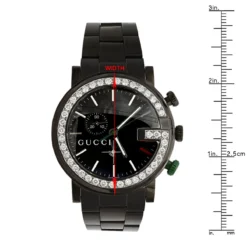 Gucci G Chrono men’s diamond watch is paved in 3.5 carats of genuine diamonds, each masterfully set around the bezel. This diamond watch features a black face with two chronograph subdials, a black tone stainless steel case and the band. Fine Swiss-made quartz movement with chronoscope function, day and date. Water-resistant 30m (100 ft).