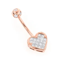 This luscious heart shaped 14K gold diamond belly button ring features 0.66 ctw of sparkling bezel set round diamonds, and 19 princess cut diamonds invisibly set in a highly polished heart shaped gold frame. This diamond belly button ring is available in 14K white, yellow, or rose gold and can be customized with different fancy color diamonds.