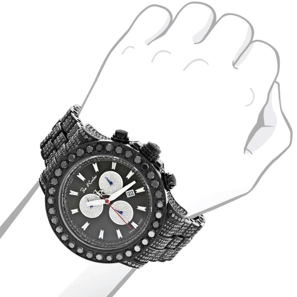Hip-Hop Watches! This Custom Joe Rodeo Men’s Black Diamond Watch – Joe Rodeo Master Pilot edition features 36.7 carats of beautiful, fancy black diamonds on the customized bezel, sides and lugs of the black stainless steel case and band. This exquisite Joe Rodeo diamond watch for men showcases a black dial with three chronograph subdials paved in sparkling white stones, a date display window at the 4 o’clock position, and a 2-row of black stones around the dial, all protected by a scratch-free crystal glass. This luxurious men’s black diamond watch by Joe Rodeo is equipped with a super accurate Swiss-made chronograph quartz movement. The case is water-resistant to 100m (330 ft). 1 year manufacturer’s warranty.