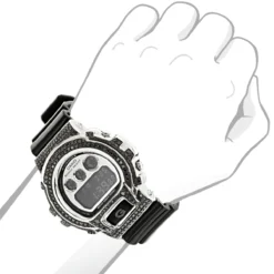 Hip Hop Watches for Men: This iced out Casio G-Shock Black Diamond Watch is based on the original DW6900 Casio G SHOCK watch model with custom black diamond bezel. This men’s diamond watch features 4 carats of black diamonds around the bezel, sterling silver bezel, a black rubber band and a digital dial code. This G-Shock diamond watch is water-resistant to 200m. G-Shock Diamond Watches are a stylish addition to any wrist.