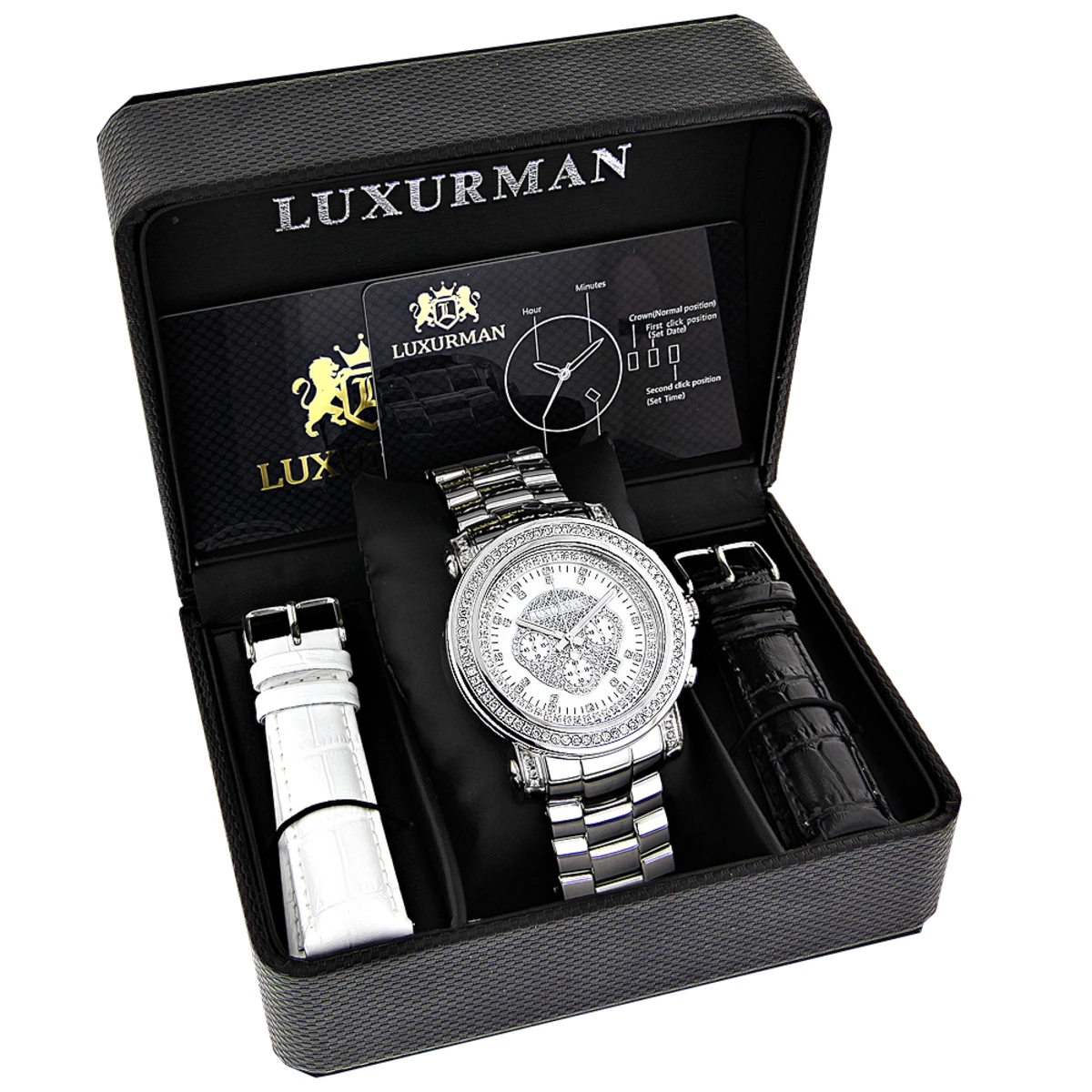Luxurman Liberty Men’s Diamond Watch Black Leather Band 44mm Bezel 2ct Swiss