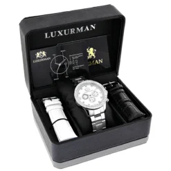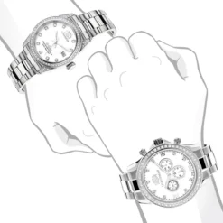 His and Hers Watch collection: white gold plated Luxurman Diamond Watch Set; these two matching diamond watches showcasing a luxurious white mother of pearl face, a white gold plated stainless steel case and white gold plated stainless steel band, this watch-set is quality made with Swiss Movement, conveniently water-resistant to 3 ATM. Ladies diamond watch features 1.5 carats of diamonds while men’s diamond watch showcases 2 carats of diamonds. Giving your partner a Luxurman Diamond Watch will surely garner their attention and ensure that you are both at the leading edge of fashion as you go out together.