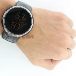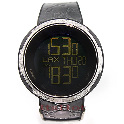 Custom Men’s Diamond Watch from Grammy Museum Edition by Gucci features 2.80 carats of genuine diamonds around the stainless steel case, a scratch-resistant sapphire crystal, a glossy rubber band with a Gucci logo motif, and a digital dial code. This diamond Gucci watch makes a luxurious gift for a special occasion.