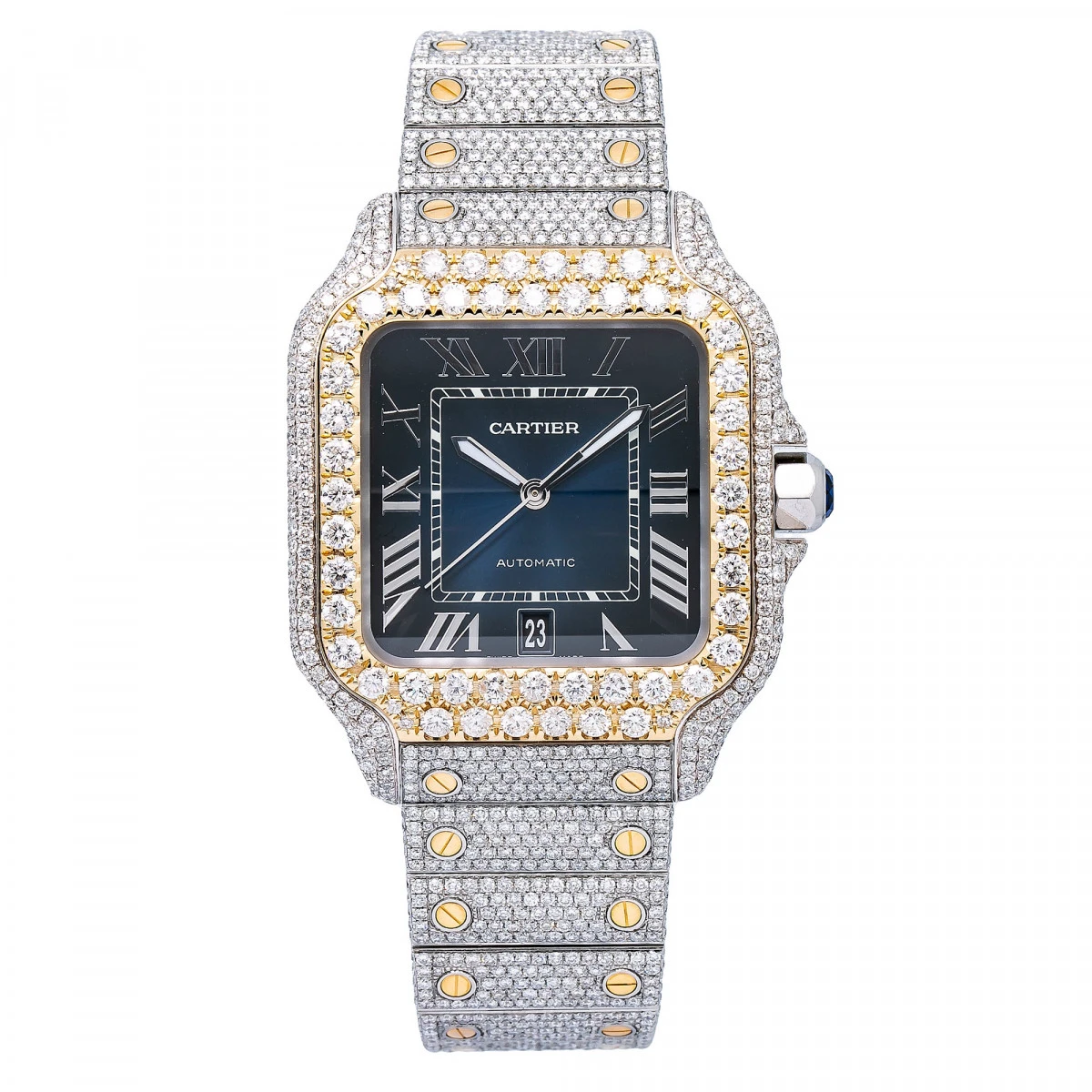 Iced-Out Cartier Santos De Cartier Watch For Men 17.95 CT 18K Gold Stainless Steel 40mm Dark Blue Dial