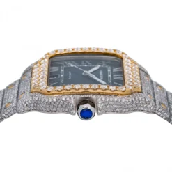 This fully paved men’s Cartier Santos watch is a luxurious timepiece that is sure to turn heads. This watch features a 40mm stainless steel case with a yellow gold bezel and 18K yellow gold and stainless steel bracelet. The watch is set with 17.95 ct of sparkling white diamonds. The dark blue dial is accented with silver-tone Roman numeral markers and silver-tone hands. The watch is powered by automatic movement and is water resistant up to 100 meters. The scratch-resistant sapphire crystal protects the dial from damage. This watch is perfect for any man who wants to make a statement with his timepiece. The Iced-Out Cartier Santos de Cartier Watch for Men comes with a 5-year warranty and is sure to become a treasured heirloom. This diamond watch is pre-owned, in excellent condition, and comes in an original box with a full warranty from ItsHot.com.