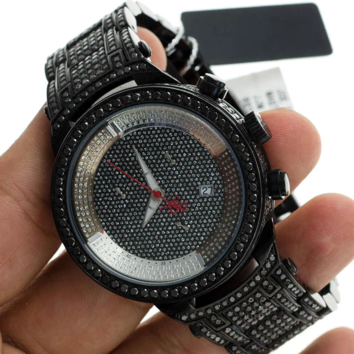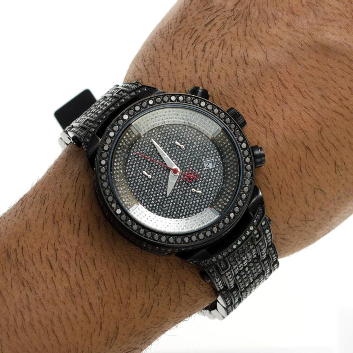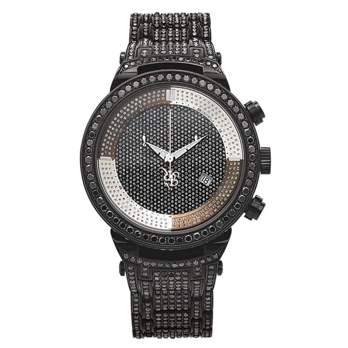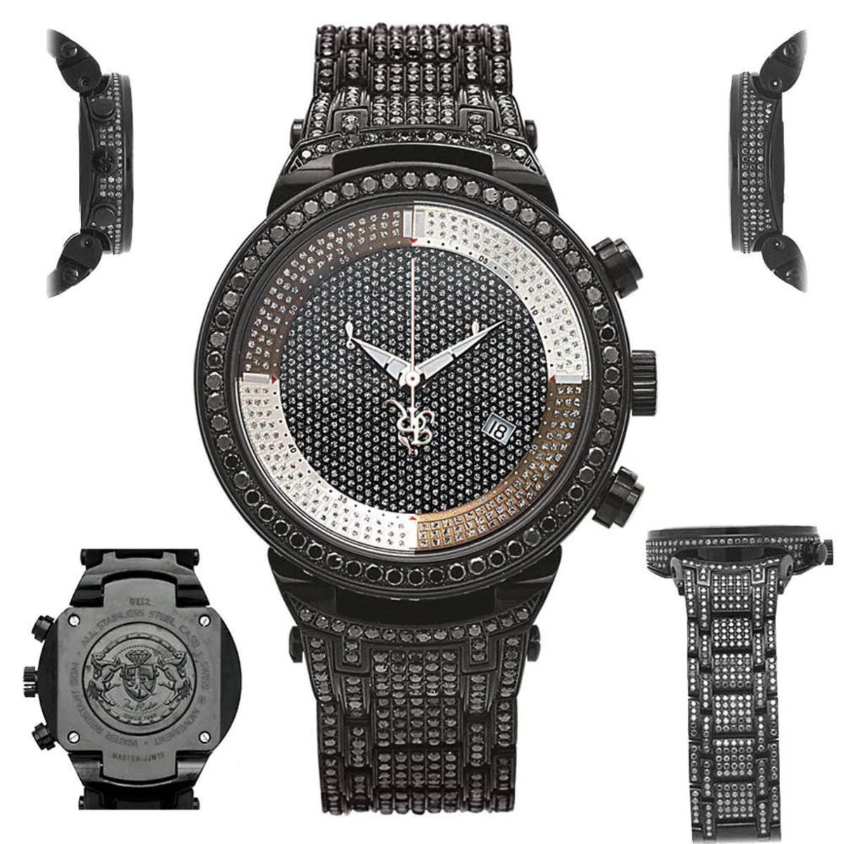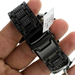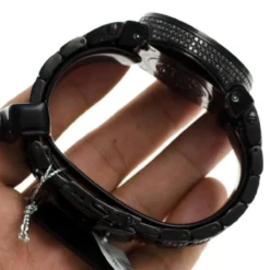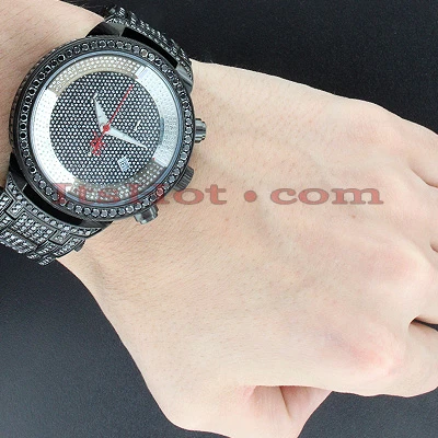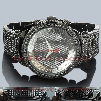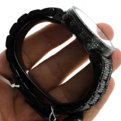 Iced Out Watches: This Joe Rodeo Black Diamond Watch – JoJo Master watch – features 25.00 carats of dazzling black diamonds on the bezel, on the sides and lugs of the black tone stainless steel case and the black tone stainless steel fully paved in black diamonds band. The face of this iced out watch is paved in glistening white stones and features second, 30-minute, 1/8 of a second chronograph subdials and a date display window at the 4 o’clock position. This luxurious men’s diamond watch by Joe Rodeo is equipped with a super accurate Swiss-made chronograph quartz movement. The case is water-resistant to 100m (330 ft).