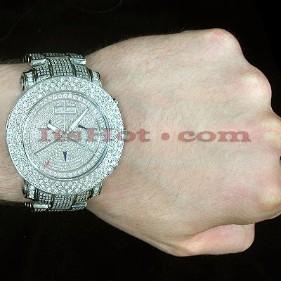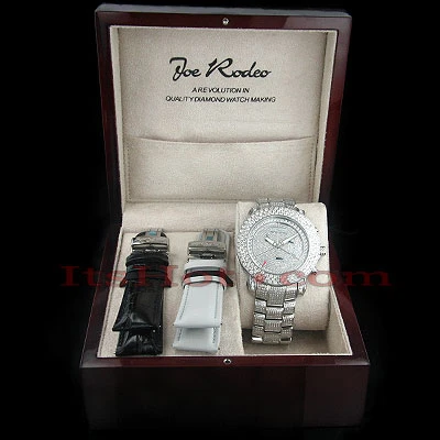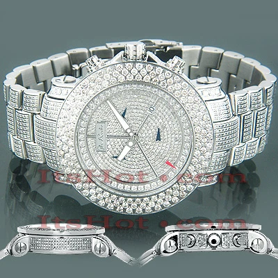Luxurious Iced Out Watches! This men’s Joe Rodeo Junior Diamond Watch is a real art piece! Featuring 22.00 carats of authentic diamonds set on the face, bezel, lugs and sides of polished stainless steel case, the stainless steel band is paved in diamonds too. This Joe Rodeo diamond watch is equipped with a super accurate Swiss-made quartz movement with chronograph function. The 316 stainless steel watch case is water-resistant to 100 meters. Two interchangeable straps in different colors come with this watch. The patented strap adjusts once for a perfect fit and comes on and off with the press of a button.