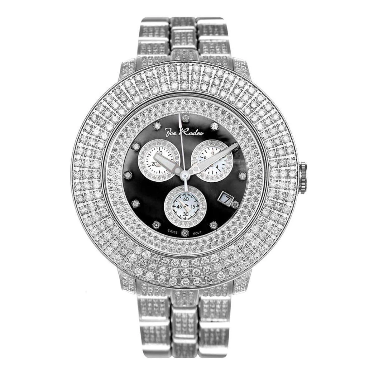 Affordable Iced Out Watches! This Joe Rodeo Pilot Diamond Watch features a huge 55mm silver gold stainless steel case with 11.00 ctw of round sparkling diamonds set on its bezel, lugs and the band. The black mother of pearl face has three chronograph subdials, a date display window at 4 o’clock position and glistening white stones set as hour markers. This Joe Rodeo watch is equipped with a super accurate Swiss-made chronograph quartz movement and is water-resistant 100m (330 ft).