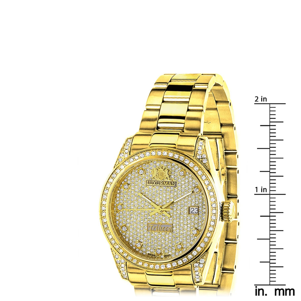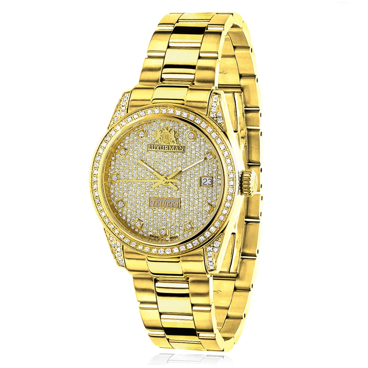 This Iced Out Luxurman Ladies Diamond Watch Tribeca is 18k Yellow Gold Plated and features a Swiss movement, 1.5 carats of genuine diamonds, a yellow gold plated face paved in sparkling stones, a date display window at a 3 o’clock position and 18k yellow gold plated band. This stylish women’s diamond watch comes with two extra leather interchangeable straps in different colors and comes with a 5 year warranty. This Luxurman Diamond watch makes a perfect present for any occasion.