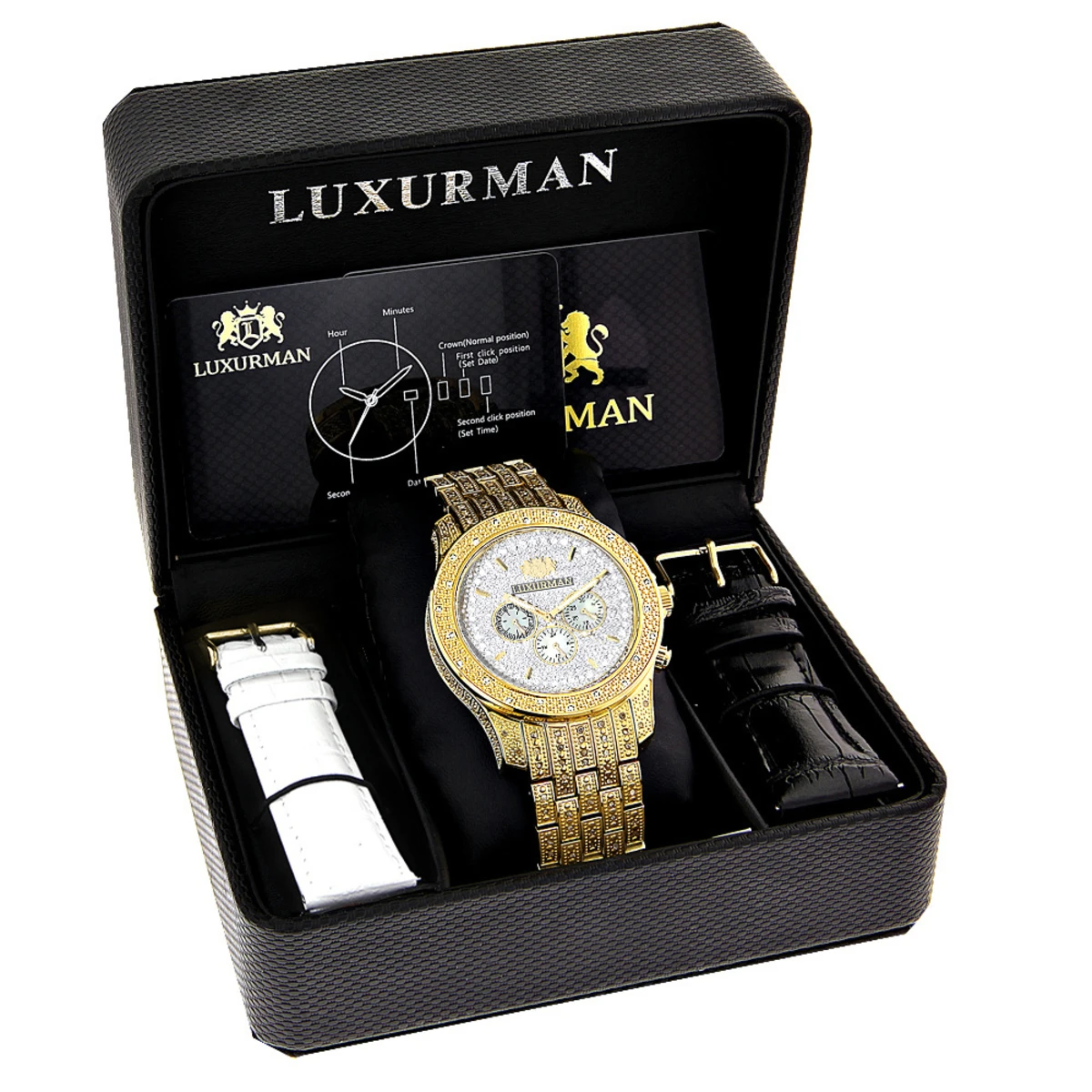 This Iced Out Luxurman Men’s Diamond Watch Yellow Gold Tone showcases 1.25 carats of genuine diamonds masterfully set on the bezel, sides, lugs and the band, features a polished 18k yellow gold plated stainless steel case with a yellow gold tone stainless steel band and a dial paved in white sparkling stones with three subdials. This Diamond Watch by Luxurman comes with two extra interchangeable leather straps in different colors. This Luxurman Diamond watch is a perfect present for any occasion.