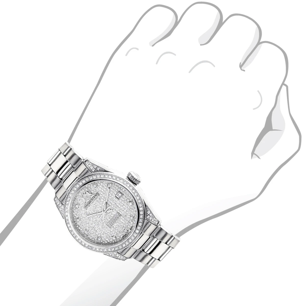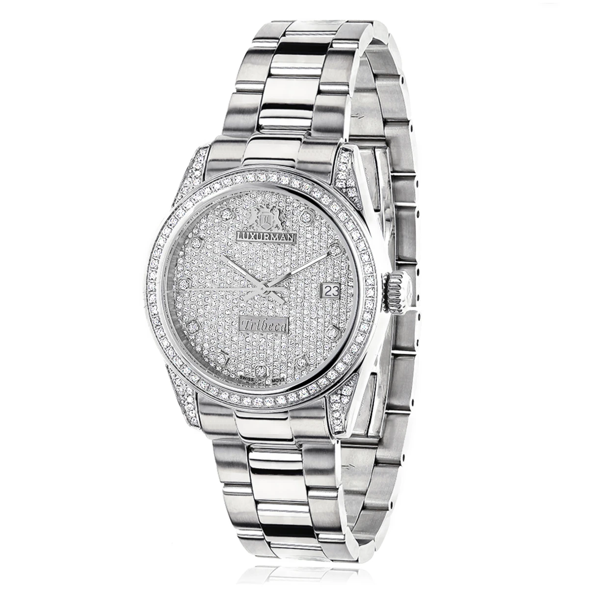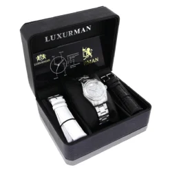This Iced Out Luxurman Women’s Diamond Watch Tribeca features 1.5 carats of genuine diamonds, Swiss movement, dial paved in sparkling stones and a date display window at a 3 o’clock position. This women’s diamond Luxurman watch comes with two extra leather interchangeable straps in different colors. This Luxurman Diamond watch makes a perfect present for any occasion, it is quality made to last and features a 5 year Luxurman warranty.