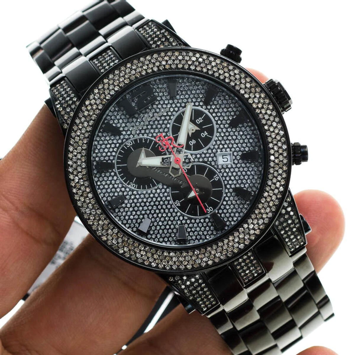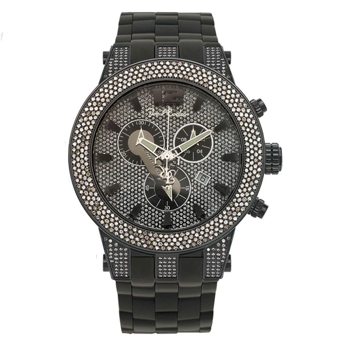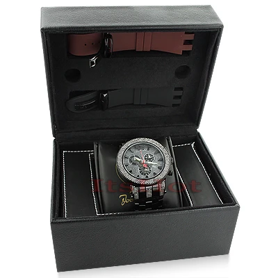 This New Joe Rodeo Broadway Men’s Diamond Watch features 5.0 carats of genuine diamonds on the bezel and lugs of the black tone stainless steel case. This Joe Rodeo diamond watch showcases a dial paved in sparkling stones with three chronograph subdials, a date display window at the 4 o’clock position, three-dimensional hour markers and a black tone stainless steel bracelet. This Joe Rodeo Broadway diamond watch comes with two interchangeable rubber bands in different colors.