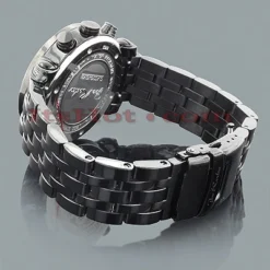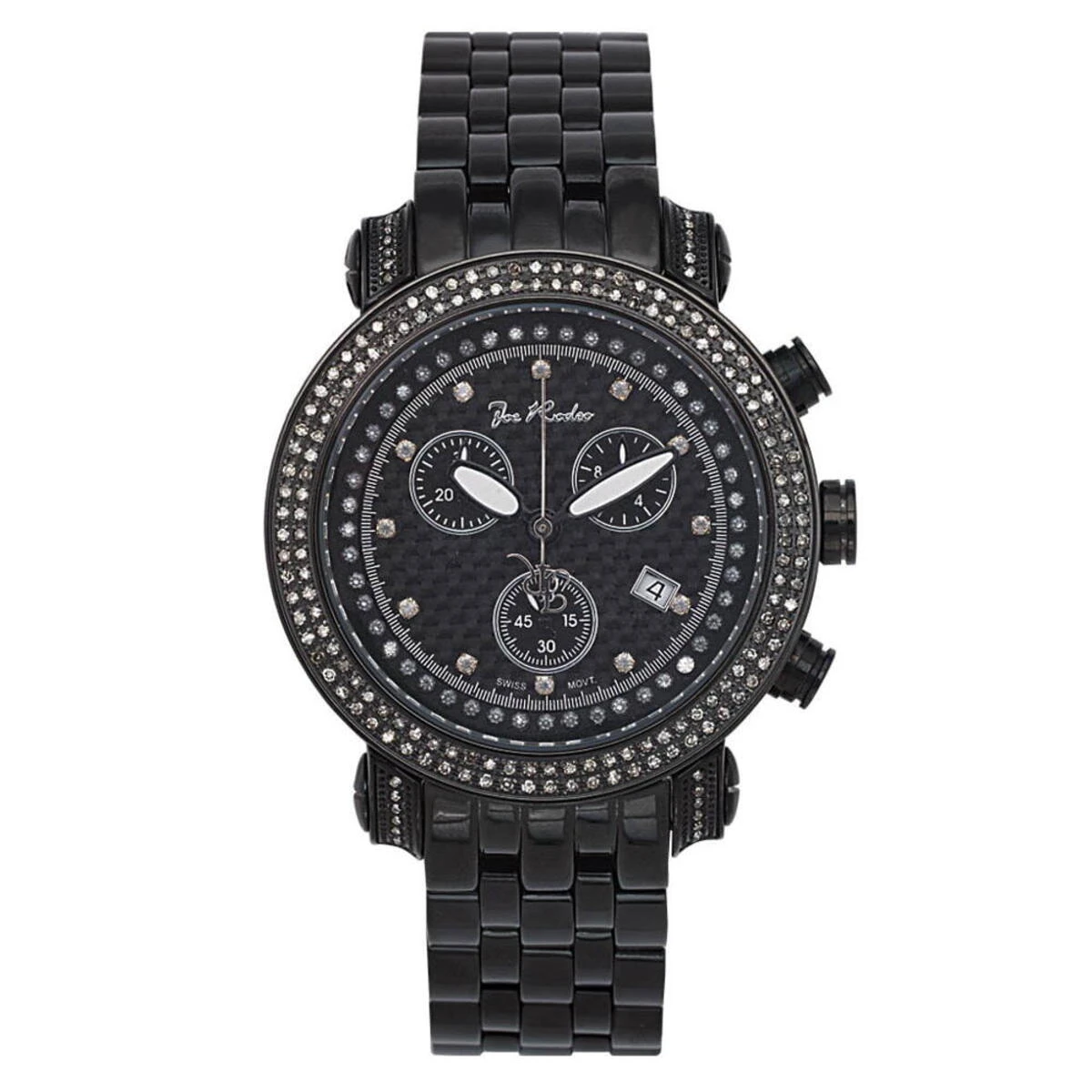 This Joe Rodeo Classic Diamond Watch Chronograph features 1.75 carats of genuine diamonds on the bezel of the black tone stainless steel case. This Joe Rodeo diamond watch showcases a black dial with three black chronograph subdials, a date display window at the 4 o’clock position, and a black tone stainless steel band. This luxurious men’s diamond watch by Joe Rodeo is equipped with a super accurate Swiss-made chronograph quartz movement.