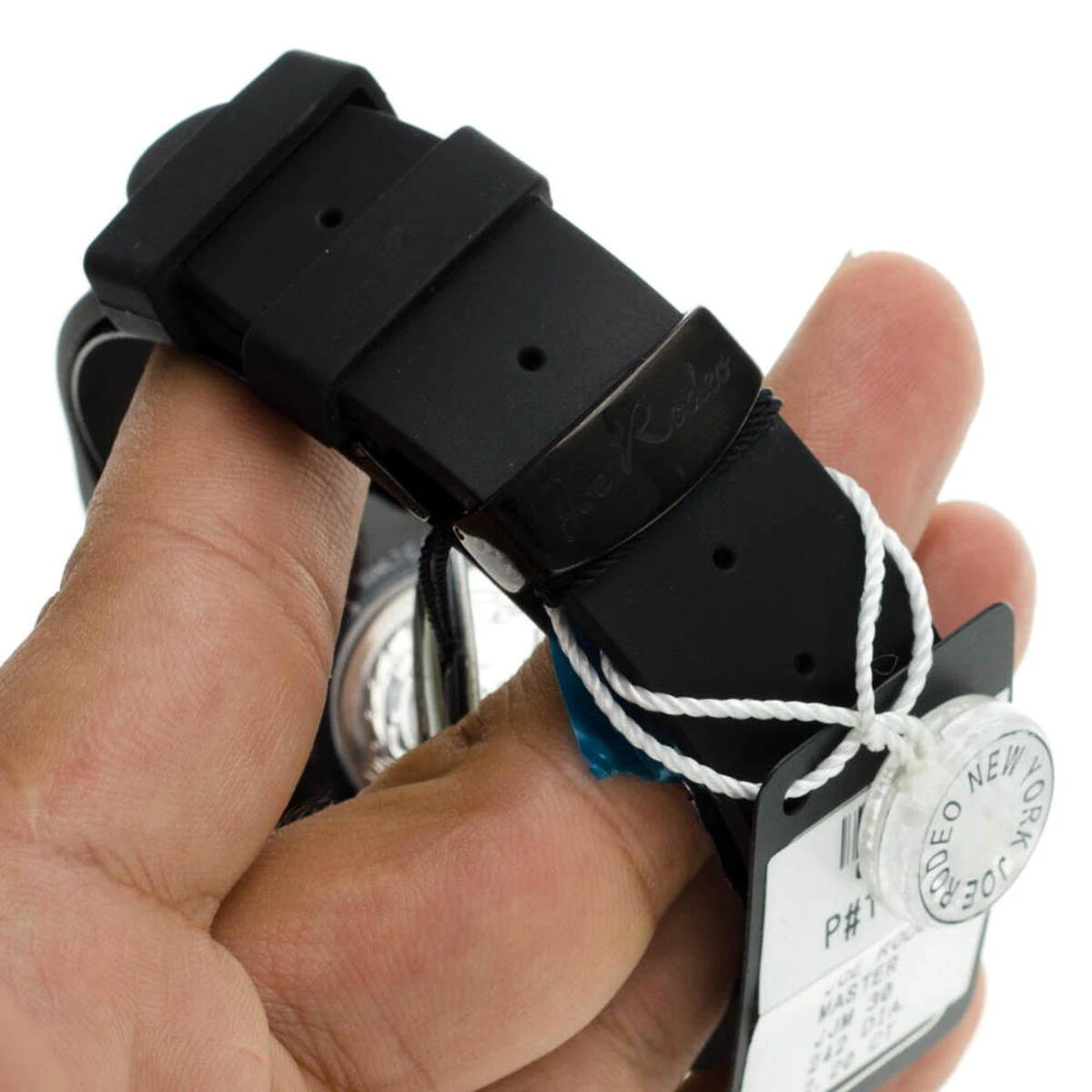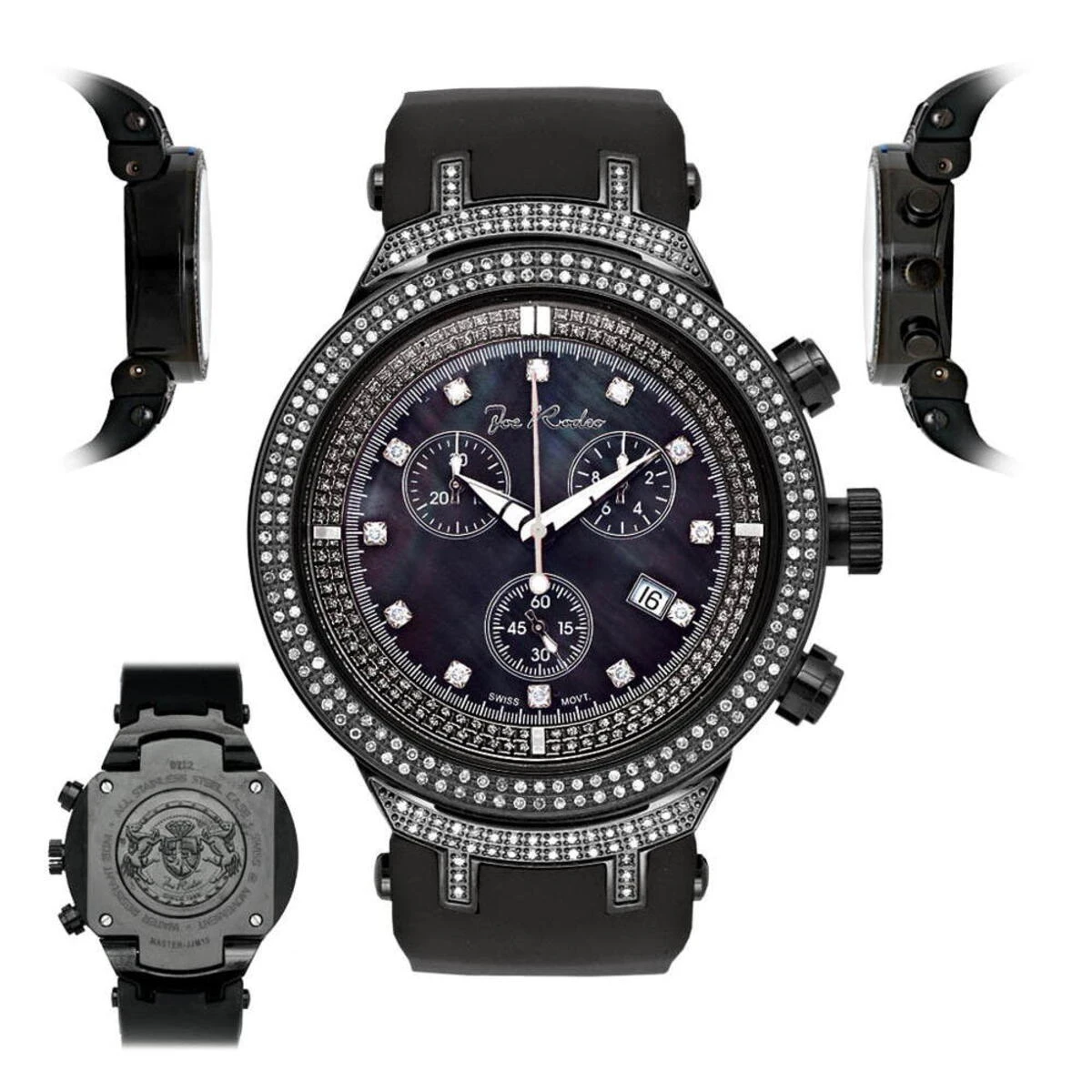Fantastic Joe Rodeo Diamond Watches! This JoJo Master Watch features a black dial, 2.20 carats of genuine diamonds on a polished black stainless steel case and lugs, a scratch-free crystal glass, an individually numbered and engraved stainless steel case-back, a black rubber band and a fine Swiss-made quartz movement. This watch is water-resistant to 100 m (300 ft). This luxurious men’s diamond watch by Joe Rodeo comes with two interchangeable rubber bands in different colors. The patented strap adjusts once for a perfect fit, and comes on and off with the press of a button.