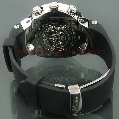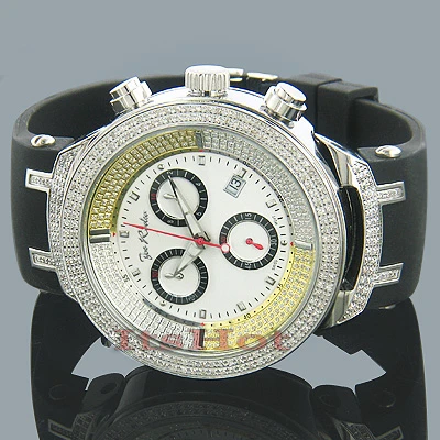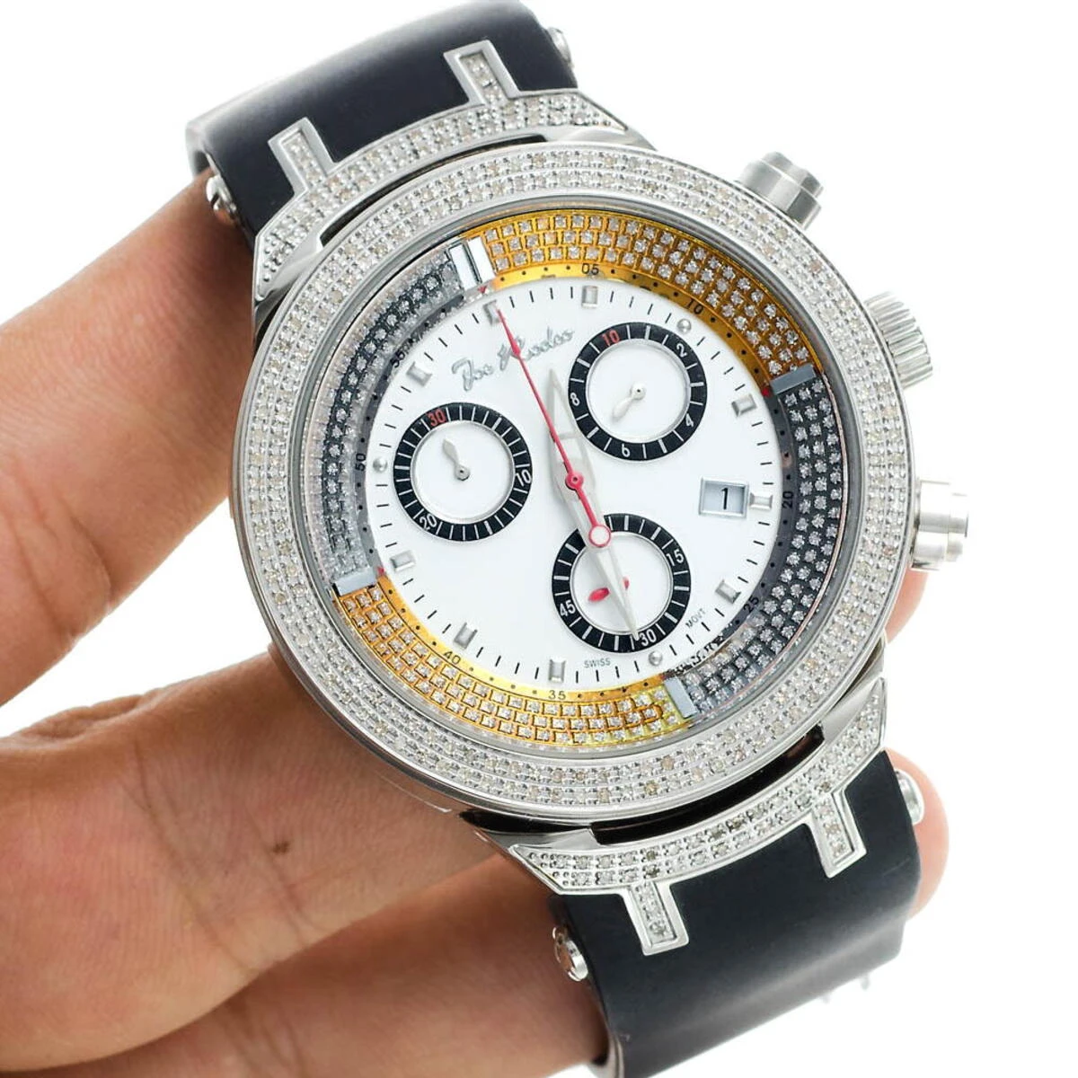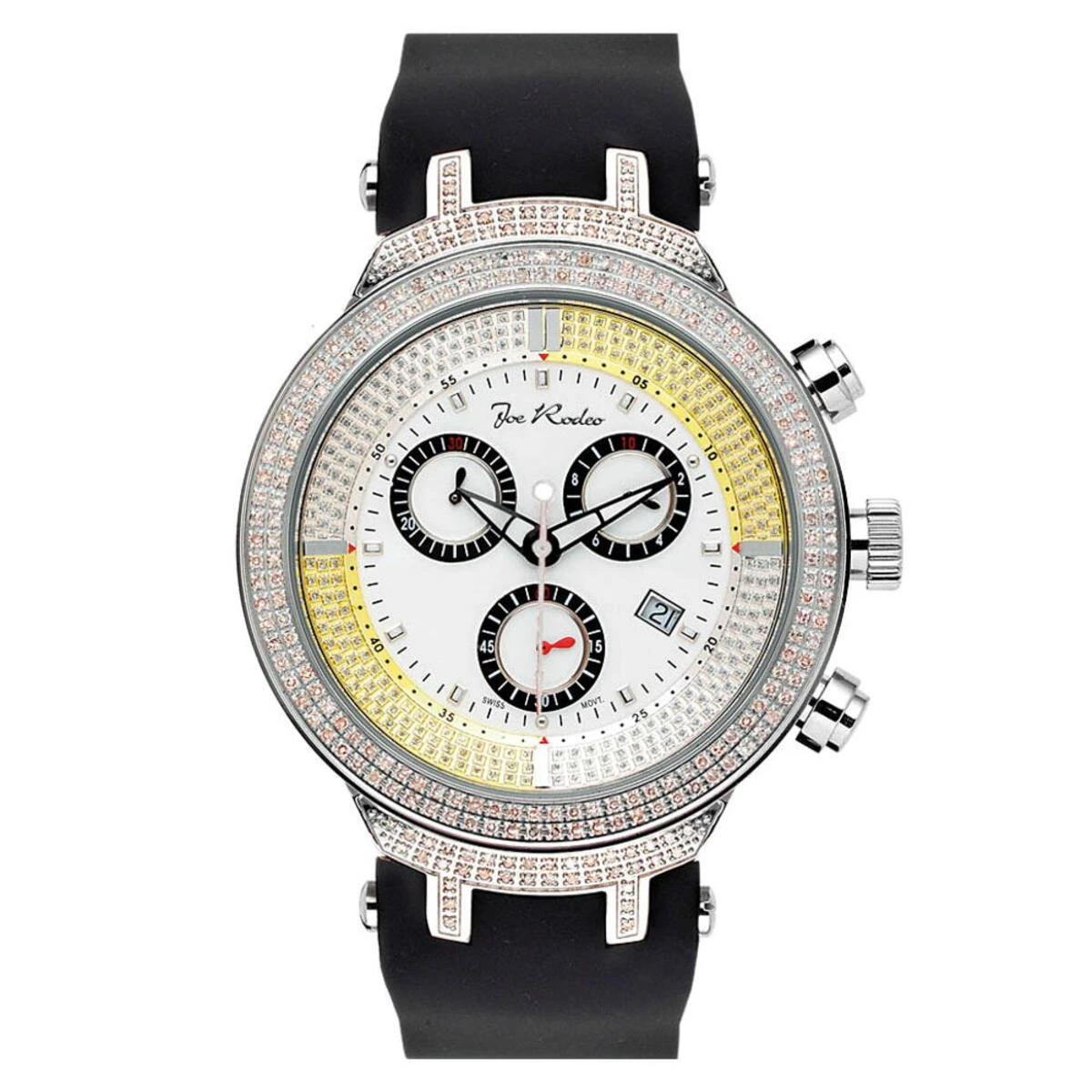From the Joe Rodeo watches collection, this contemporary diamond JOJO watch features 2.20 carats of round diamonds, polished stainless steel case, scratch-free crystal glass, individually numbered and engraved stainless steel case-back. Diamond Bezel, Silver Stainless Steel case and Black dial. Fine Swiss-made quartz movement with chronograph function, center second and date. Water-resistant to 100 meters. Comes with two interchangeable rubber straps in different colors. The patented strap adjusts once for a perfect fit, and comes on and off with the press of a button.