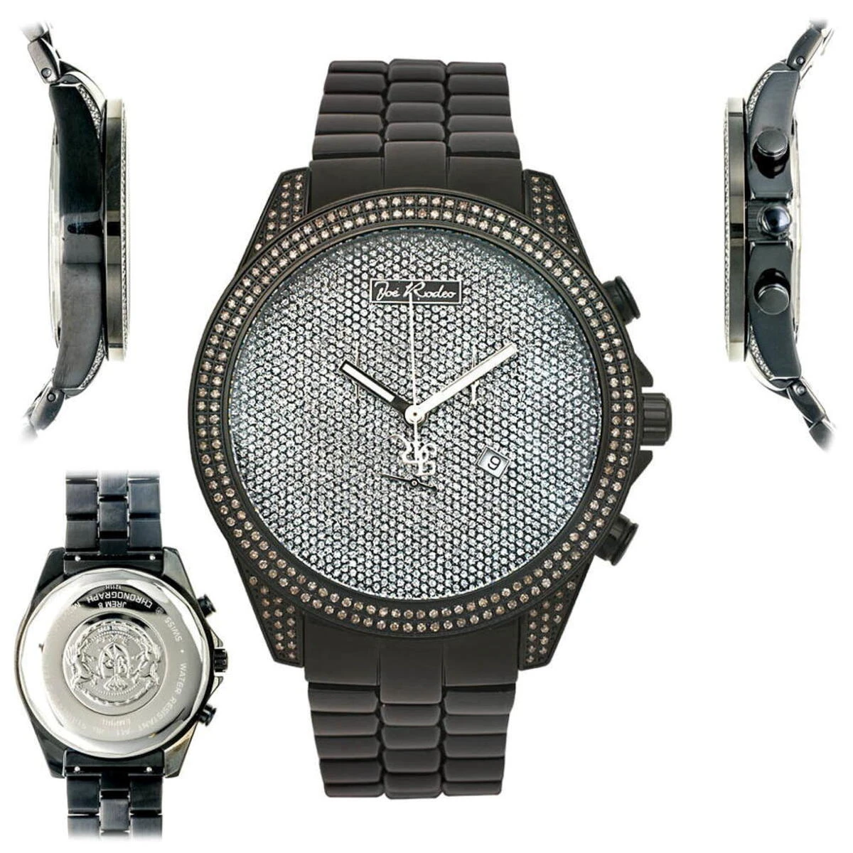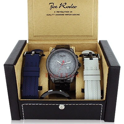 New Joe Rodeo Watches: This Empire Men’s Diamond Watch features 2.25 carats of genuine diamonds, a black tone stainless steel case and a black tone stainless steel band. The watch showcases a dial paved with sparkling stones, a chronograph function and a date display window at the 4 o’clock position. This Joe Rodeo Empire Diamond Watch is equipped with a very accurate Swiss-made quartz chronograph movement and comes with extra interchangeable watch bands in different colors.