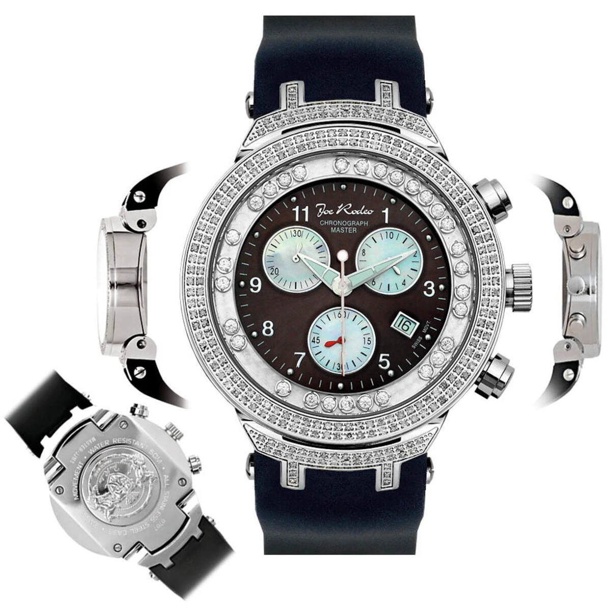 Unique Joe Rodeo watches: this Joe Rodeo Master watch features 2.2 ctw. of genuine diamonds, gold plated stainless steel case and an individually numbered and ingraved stainless steel back. Water-resistant to 100m (300ft). This diamond Joe Rodeo watch is guaranteed to be 100% brand new and authentic and will come in original manufacturing packaging with all original paperwork. 1 Year Manufacturer’s warranty.