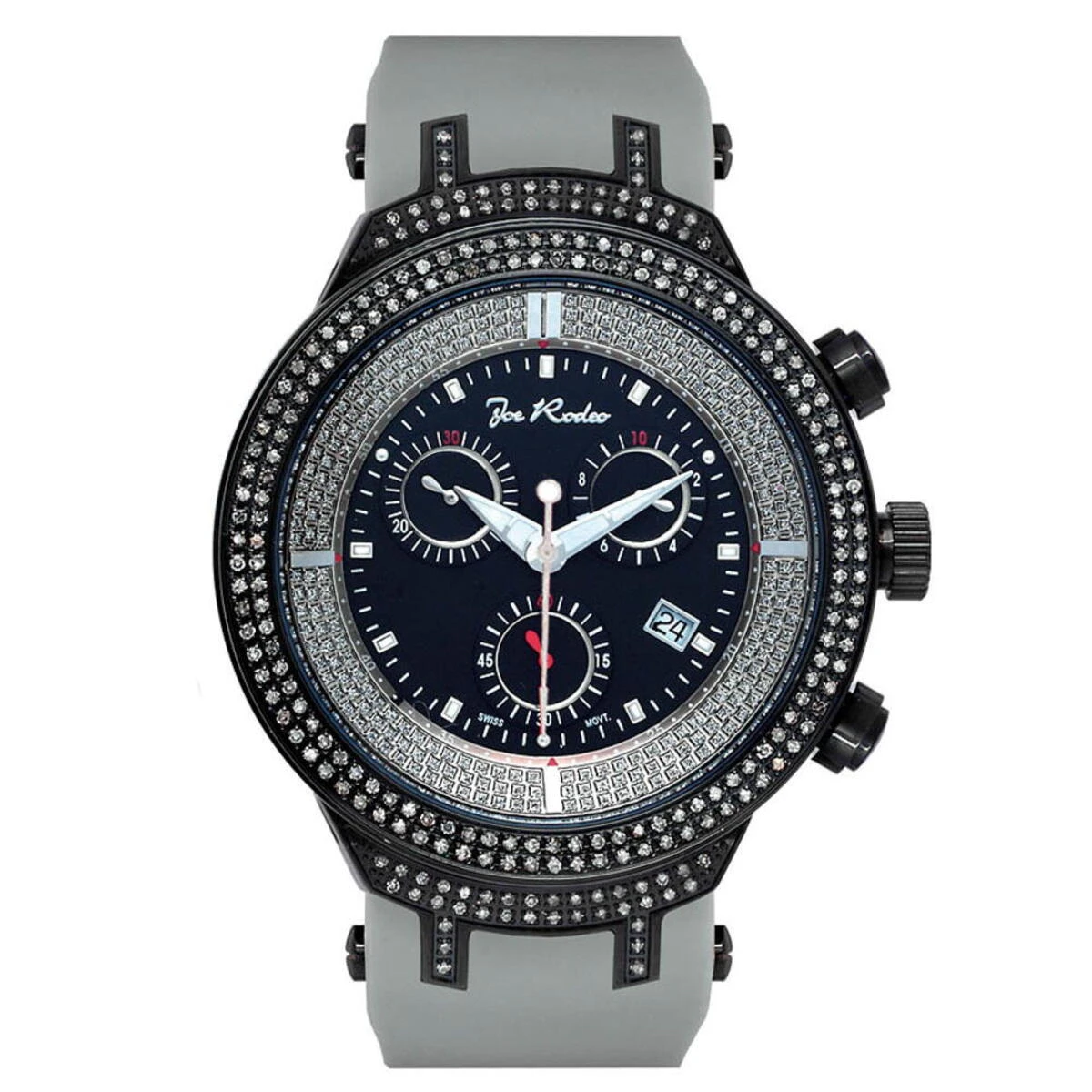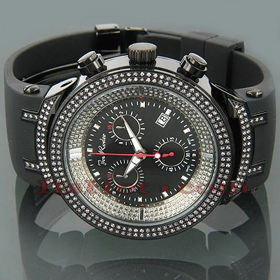 This men’s Joe Rodeo Watches JoJo Master Watch packs 2.20 carats of authentic diamonds in polished black stainless steel case and lugs. This model has a plain black face with three chronograph subdials on it. Fine Swiss-made quartz movement is set in a water-resistant to 50 m (165 ft) case. This men’s diamond watch from Joe Rodeo watches collection comes with two interchangeable rubber straps in different colors. The patented strap adjusts once for a perfect fit, and comes on and off with the press of a button.