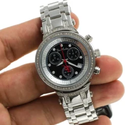 This impressive 0.90-carat Joe Rodeo Master Ladies Diamond Watch features an individually numbered and engraved stainless steel case-back, a genuine diamond bezel, a polished silver tone stainless steel case, a stainless steel and black mother of pearl face with three chronograph subdials, a date display window at the 4 o’clock position, and a row of white stones around it. This Joe Rodeo diamond watch is water-resistant to 50 meters and comes with two interchangeable straps in different colors. The patented strap adjusts once for a perfect fit, and comes on and off with the press of a button.