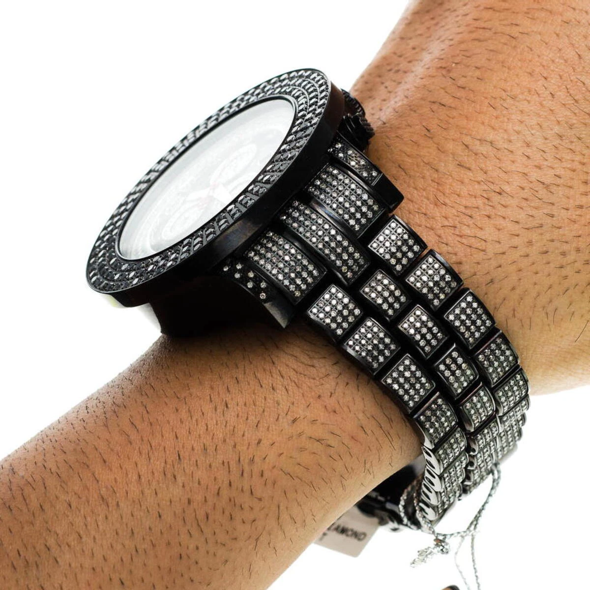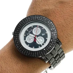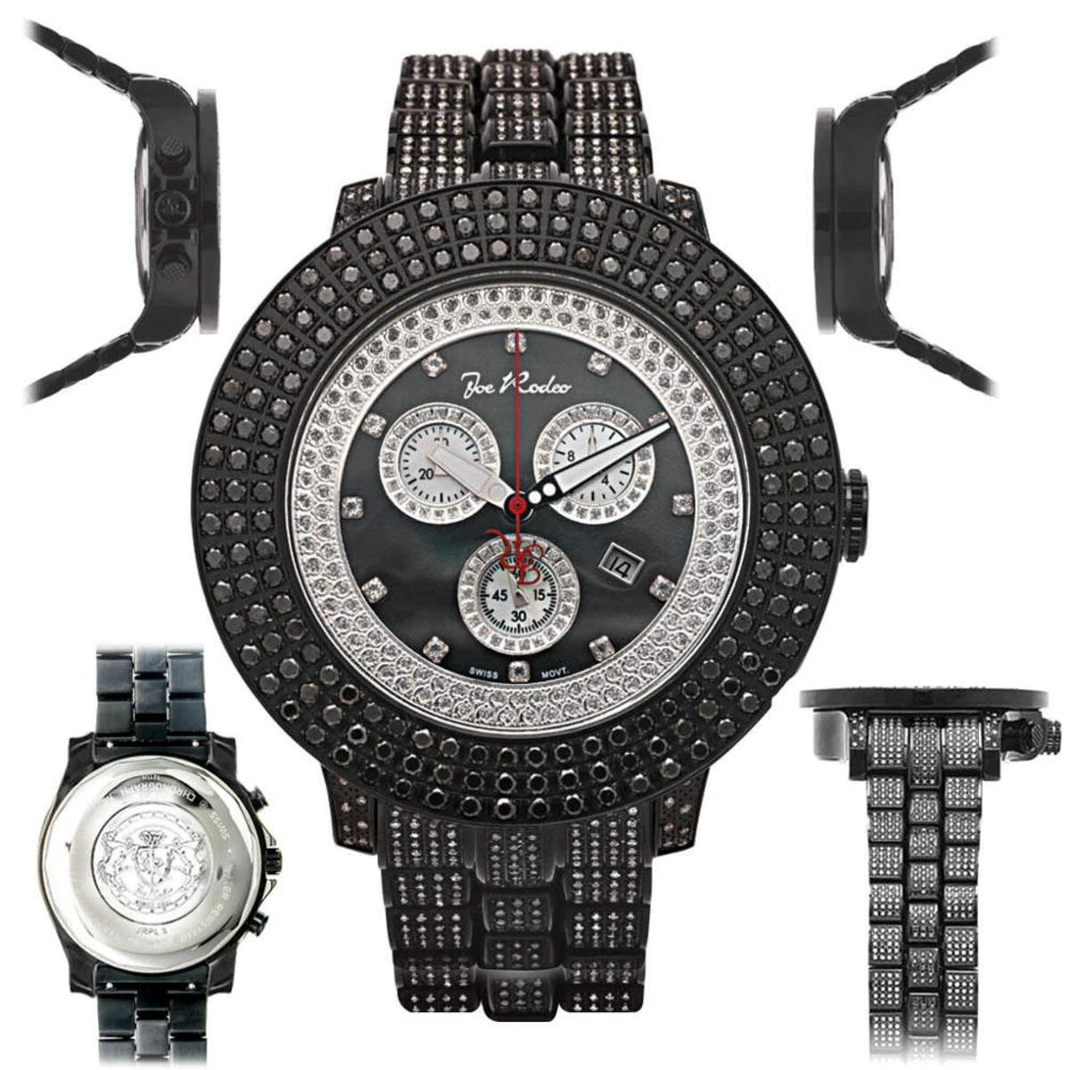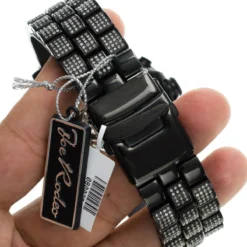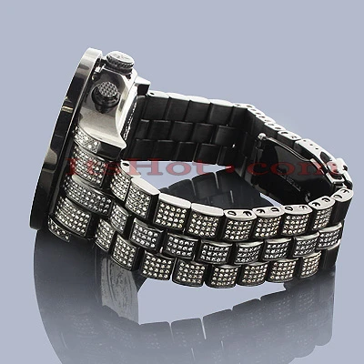 This Joe Rodeo Men’s Black Diamond Watch Pilot features 17.00 carats of sparkling black diamonds on the bezel, white diamonds on the lugs of the black tone stainless steel case and a black tone stainless steel fully paved in diamonds band. This exquisite Joe Rodeo diamond watch showcases a black mother of pearl dial with three chronograph subdials paved in sparkling white diamonds, a date display window at the 4 o’clock position, and 2-rows of glistening white stones around it. This luxurious men’s diamond watch by Joe Rodeo is equipped with a super accurate Swiss-made chronograph quartz movement. The case is water-resistant to 100m (330 ft).