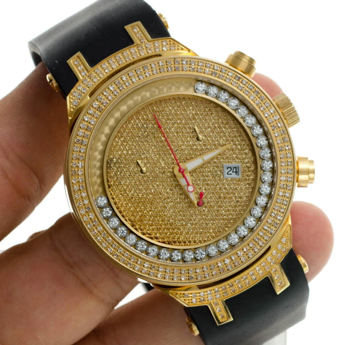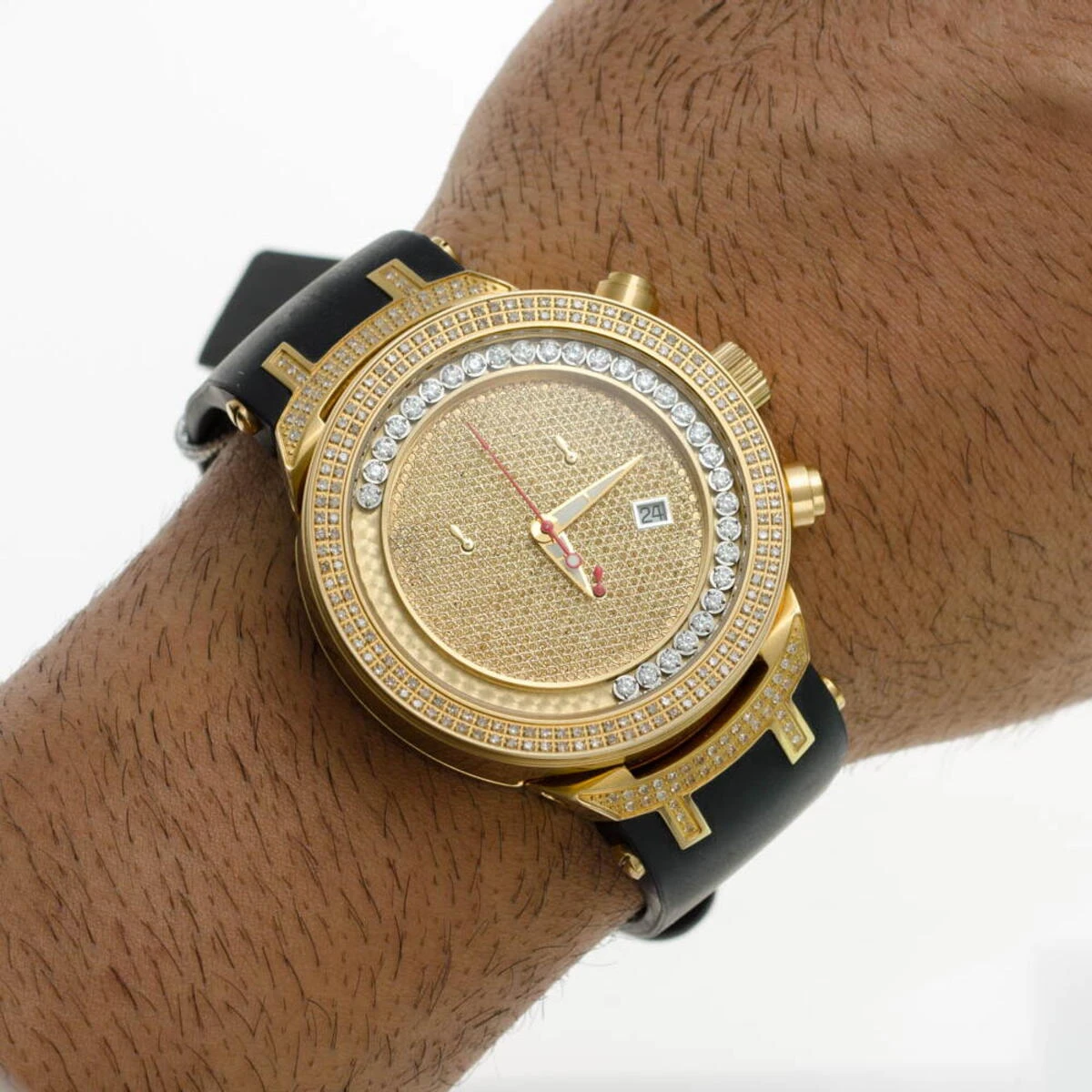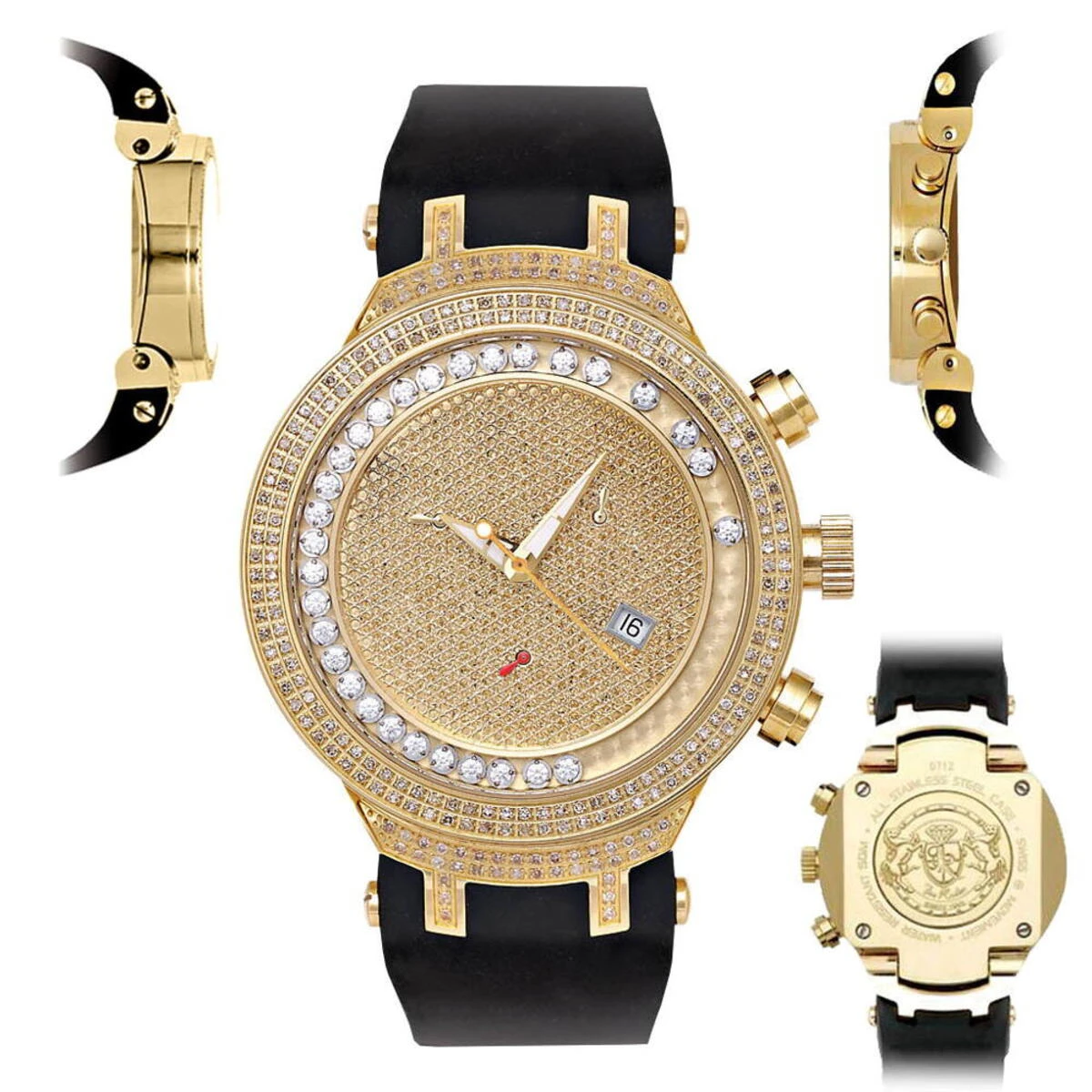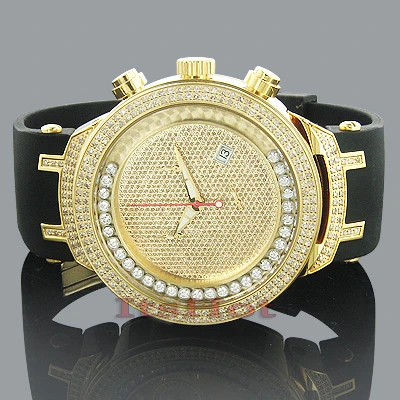 Unique Joe Rodeo Watches! This Men’s JoJo Master Diamond Watch by Joe Rodeo features 2.20 carats of round diamonds masterfully set on the bezel and lugs. A row of white sparkling stones floats around the dial. The yellow gold tone stainless steel case houses a fine Swiss-made quartz chronograph movement with a date indicator. This Joe Rodeo diamond watch comes with two interchangeable rubber watch straps in different colors. The patented strap adjusts once for a perfect fit, and comes on and off with the press of a button.