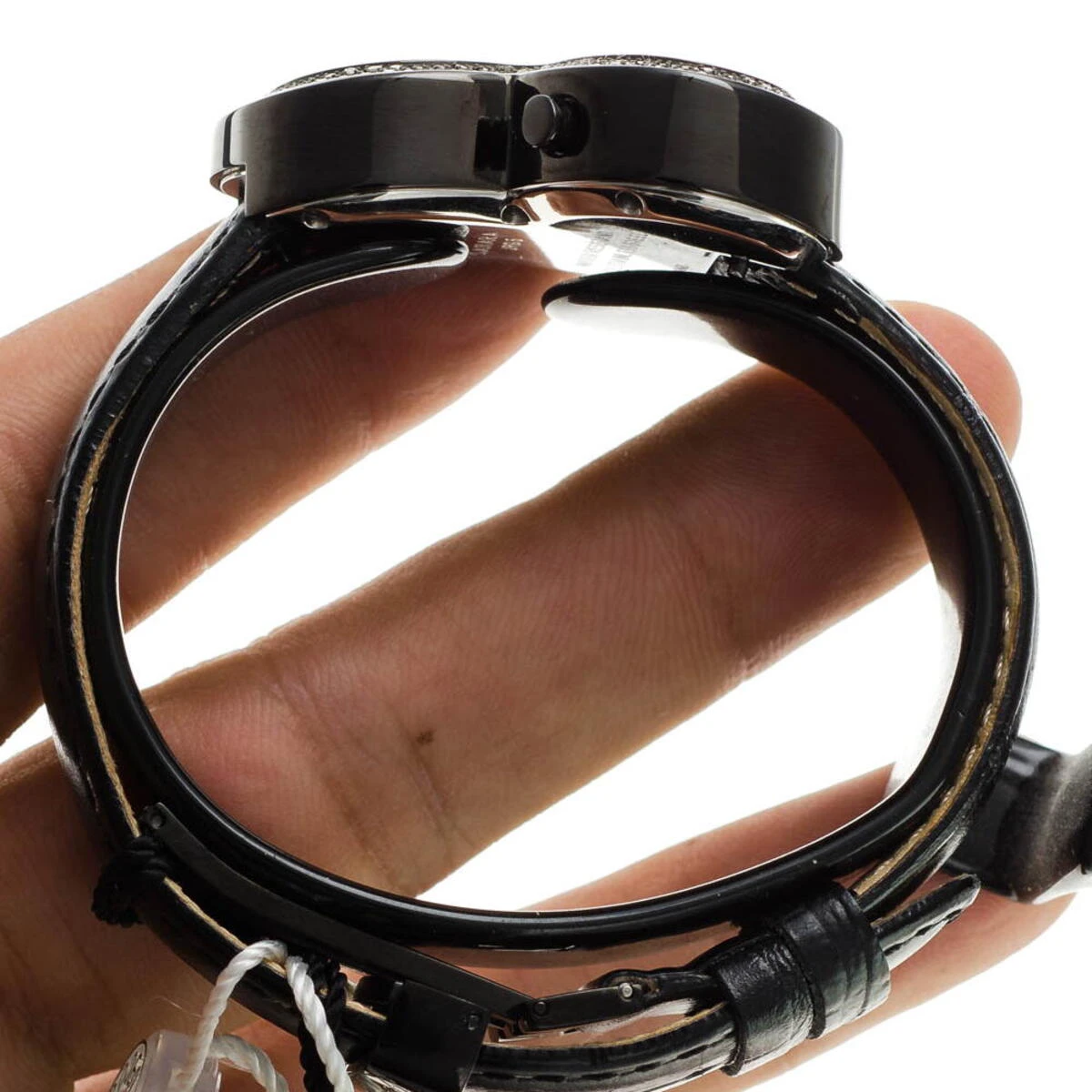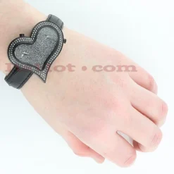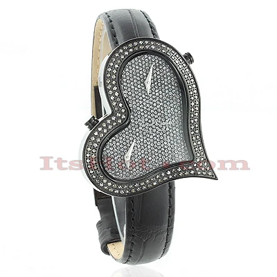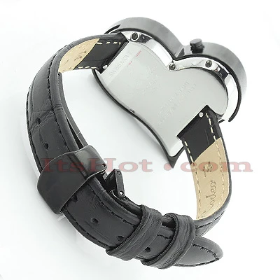 This Joe Rodeo Sahara Diamond Heart Watch features 1.40 carats of genuine diamonds set around the bezel of the black tone stainless steel case, the face paved in white spakling stones with two dials and a black leather band. The polished, water-resistant, heart-shaped black stainless steel case houses an accurate Swiss-made quartz movement with a dual time zone function. Two interchangeable straps in different colors come with the watch. The patented strap adjusts once for a perfect fit, and comes on and off with the press of a button.