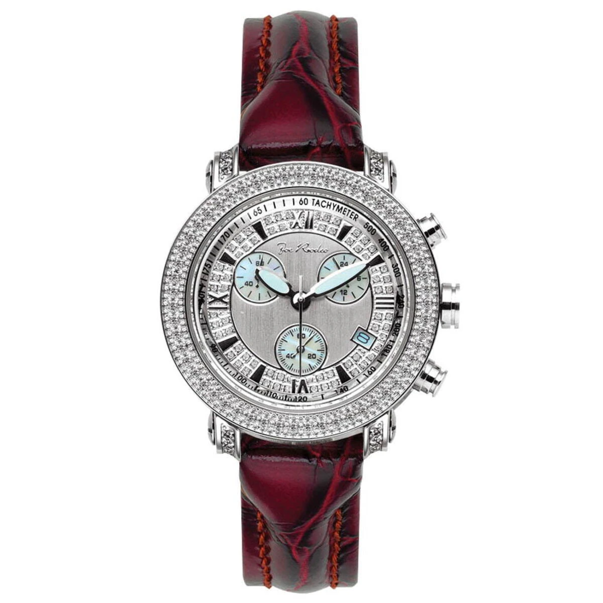 This Joe Rodeo Women’s Diamond Watch features 0.60 carats of white genuine diamonds around the bezel and on the lugs of highly polished silver stainless steel case. Accurate Swiss-made quartz movement with chronograph function. This women’s diamond watch from Joe Rodeo watches collection comes with two extra interchangeable bands in different colors. Water-resistant 100m (330 ft).