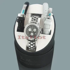 This dazzling Joe Rodeo women’s diamond watch features 1.25 carats of diamonds, round polished Silver stainless steel case, scratch-free crystal glass, individually numbered and engraved stainless steel case-back. Black mother of pearl face. Stainless steel band. Fine Swiss-made quartz movement. Water-resistant to 100 m (300 ft). This fine diamond watches collection piece by Joe Rodeo comes with two extra interchangeable bands in different colors. The patented strap adjusts once for a perfect fit, and comes on and off with the press of a button.