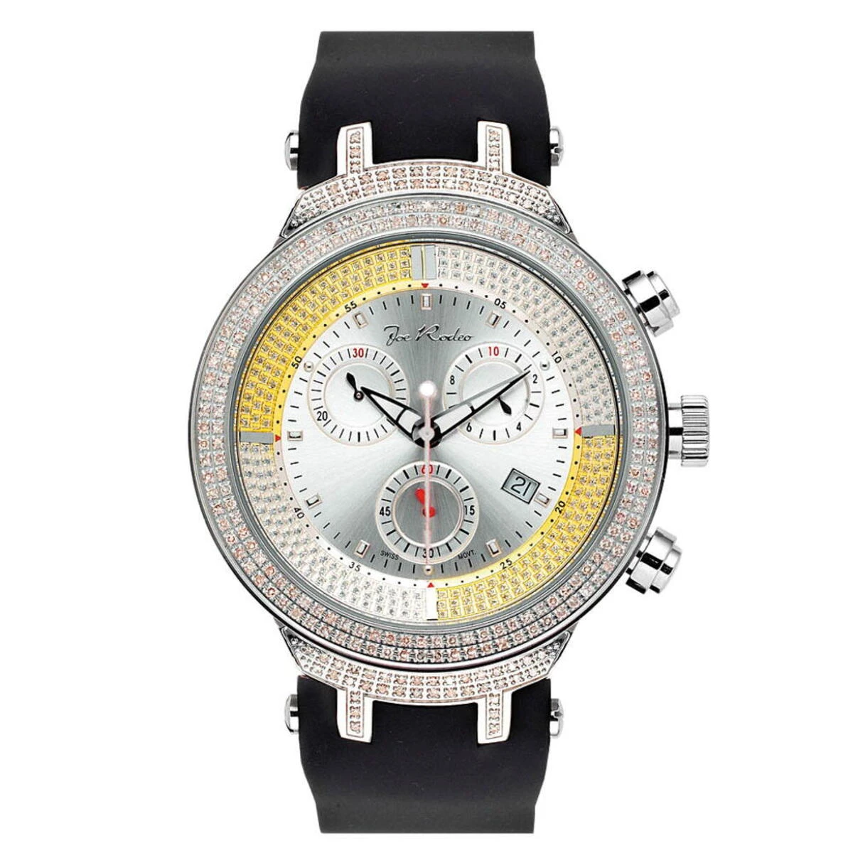 This 2.20-carat JOJO Joe Rodeo watches collection piece features a polished stainless steel case, scratch-free crystal glass, individually numbered and engraved stainless steel case-back. Diamond Bezel, Silver Stainless Steel case and Silver dial with yellow inlays. Fine Swiss-made quartz movement with chronograph function, center second and date. Water-resistant to 100 meters. Comes with two interchangeable rubber straps in different colors. The patented strap adjusts once for a perfect fit, and comes on and off with the press of a button.