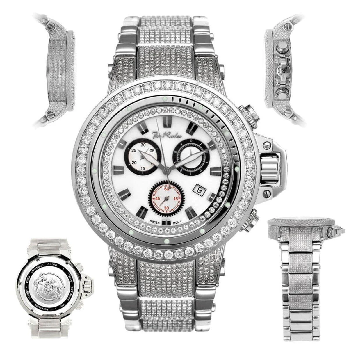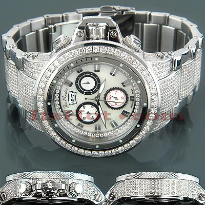 Introducing new top of the line JoJo Joe Rodeo Razor Men’s Diamond Watch that features 22.00 carats of beautiful diamonds on the bezel, sides and lugs of stainless steel case and diamond stainless steel band. The white mother of pearl dial with three chronograph subdials, unique date display window at 12 o’clock position and a row of glistening white stones around it is protected by a scratch-free crystal glass. This watch is equipped with a super accurate Swiss-made chronograph quartz movement. The case is water-resistant 100m (330 ft).
