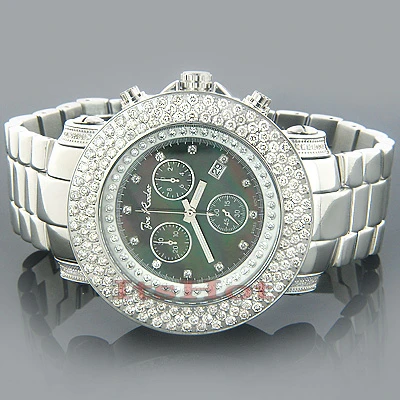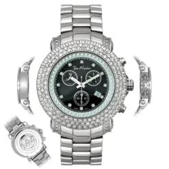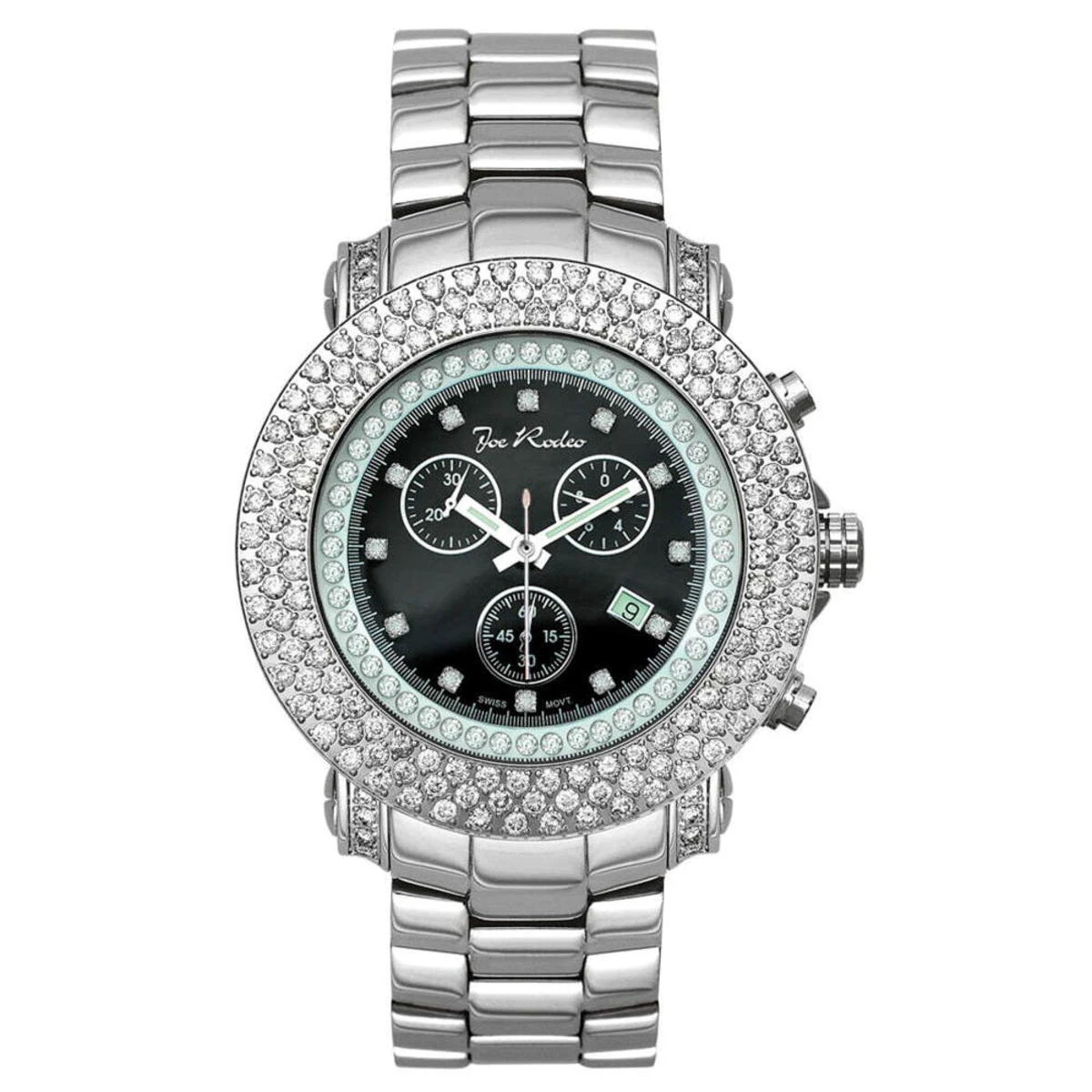 This Men’s JoJo Watch Joe Rodeo Junior Diamond Watch features 6.00 carats of diamonds that are sparkling on the bezel and lugs of polished stainless steel case. The black mother of pearl face has three chronograph subdials and date display window at 4 o’clock position. This watch is equipped with a super accurate Swiss-made quartz movement with chronograph function, center second and date. This men’s diamond watch from Joe Rodeo watches collection has a case water-resistant to 100 meters. Two interchangeable straps in different colors come with this watch. The patented strap adjusts once for a perfect fit and comes on and off with the press of a button.
