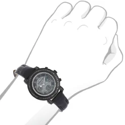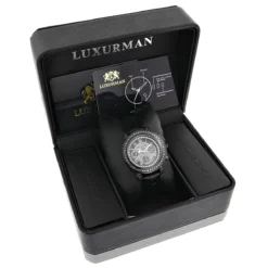 This Ladies Black Diamond Watch by LUXURMAN Watches showcases 2.15 carats of sparkling black diamonds. This Luxurman diamond watch features a black mother of pearl dial paved in sparkling stones with three subdials, a black tone stainless steel case and a black genuine leather band.