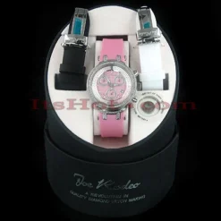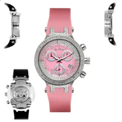 This Ladies Diamond Joe Rodeo Watch Pink Master features 0.90 carats of genuine diamonds on the bezel and lugs of the round polished silver stainless steel case and pink rubber strap that matches the dial. This women’s diamond watch from Joe Rodeo watches collection is equipped with a fine Swiss-made quartz chronograph movement with date indicator. Comes with two interchangeable rubber bands in different colors. The patented strap adjusts once for a perfect fit, and comes on and off with the press of a button.