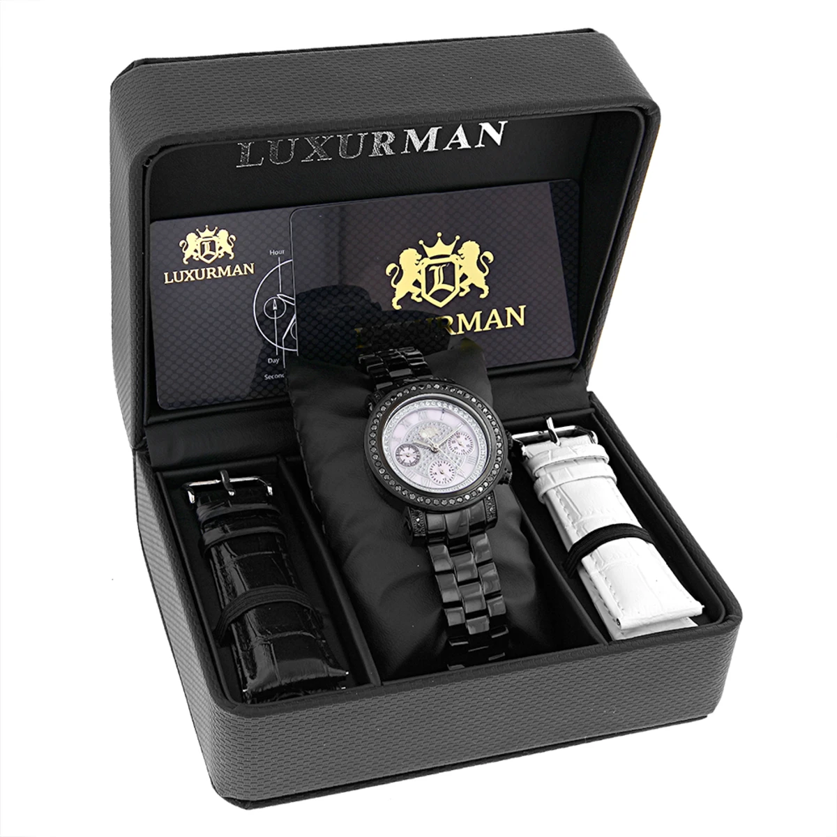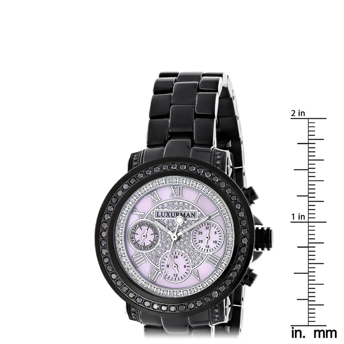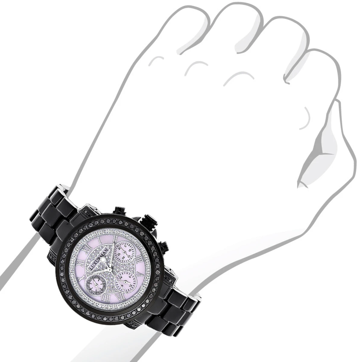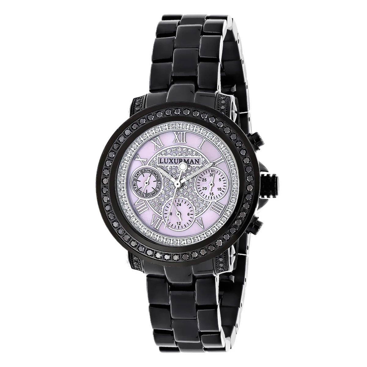 Introducing a unique Luxurman Black Diamond Watch from our Ladies Diamond Watches collection; showcases 2.15 carats of sparkling black diamonds. This Luxurman black diamond watch for women features a pink dial paved in sparkling stones with three subdials, a black tone stainless steel case and a polished black tone stainless steel band. What a unique gift for a special occasion!