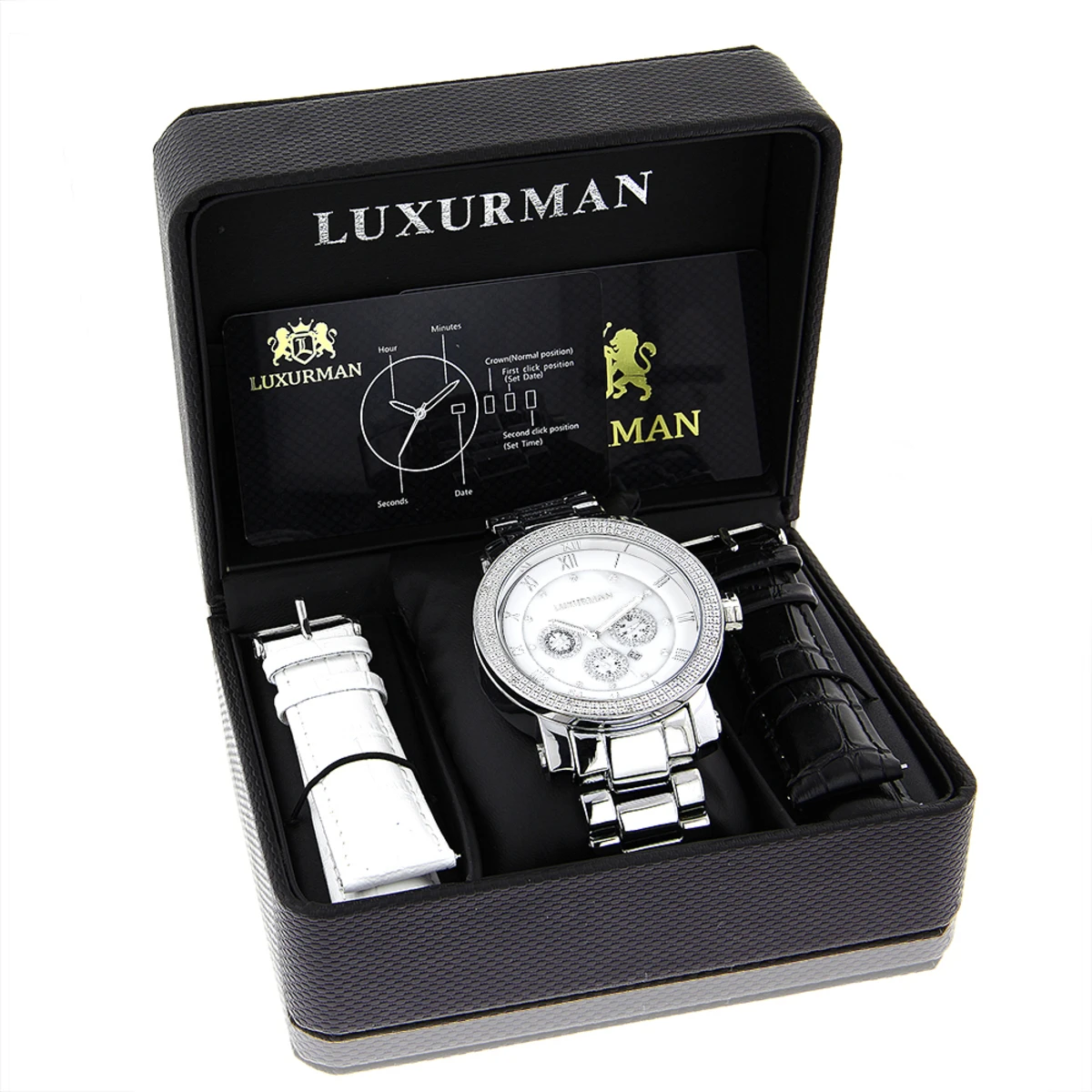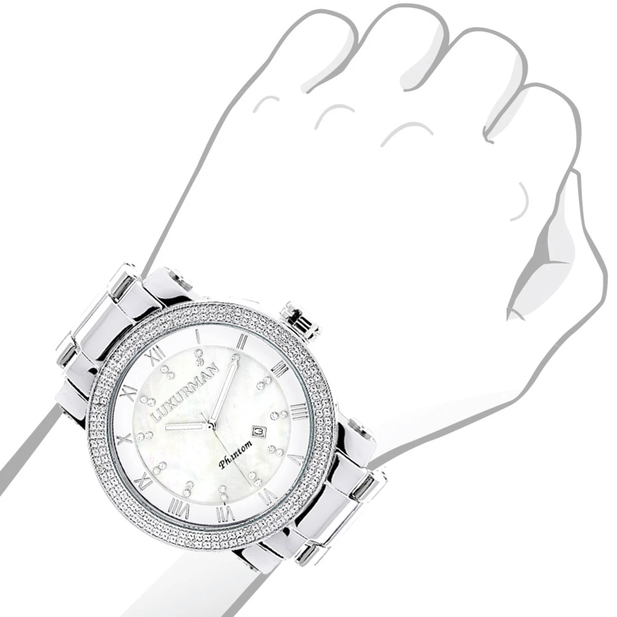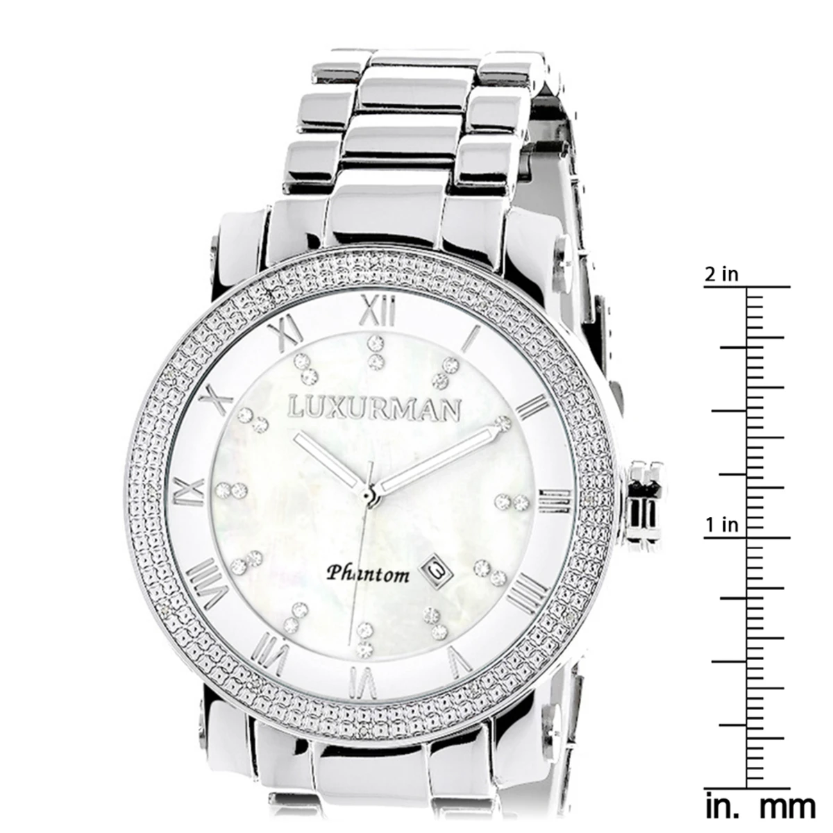 Luxurious Luxurman Diamond Watches! This Men’s Diamond Watch features 0.12 carats of genuine diamonds, a polished silver tone stainless steel case with a stainless steel band, a white mother of pearl dial with day, date and 24 hours subdials. This Luxurman diamond watch is conveniently water-resistant to 30 m (110 ft).