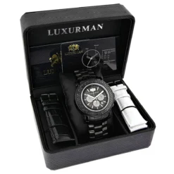 This Luxurman Escalade Men’s Black Diamond Watch Oversized Chronograph is an oversized watch 50mm wide and showcases 4.75 carats of black diamonds. This Luxurman diamond watch for men features a black mother of pearl dial surrounded in sparkling stones, a black tone stainless steel case and a black tone stainless steel band, 3 chronograph subdials and a date window on 4 o’clock position. This men’s’ diamond watch comes in full retail packaging with two extra leather bands (white and black) and includes full factory warranty.