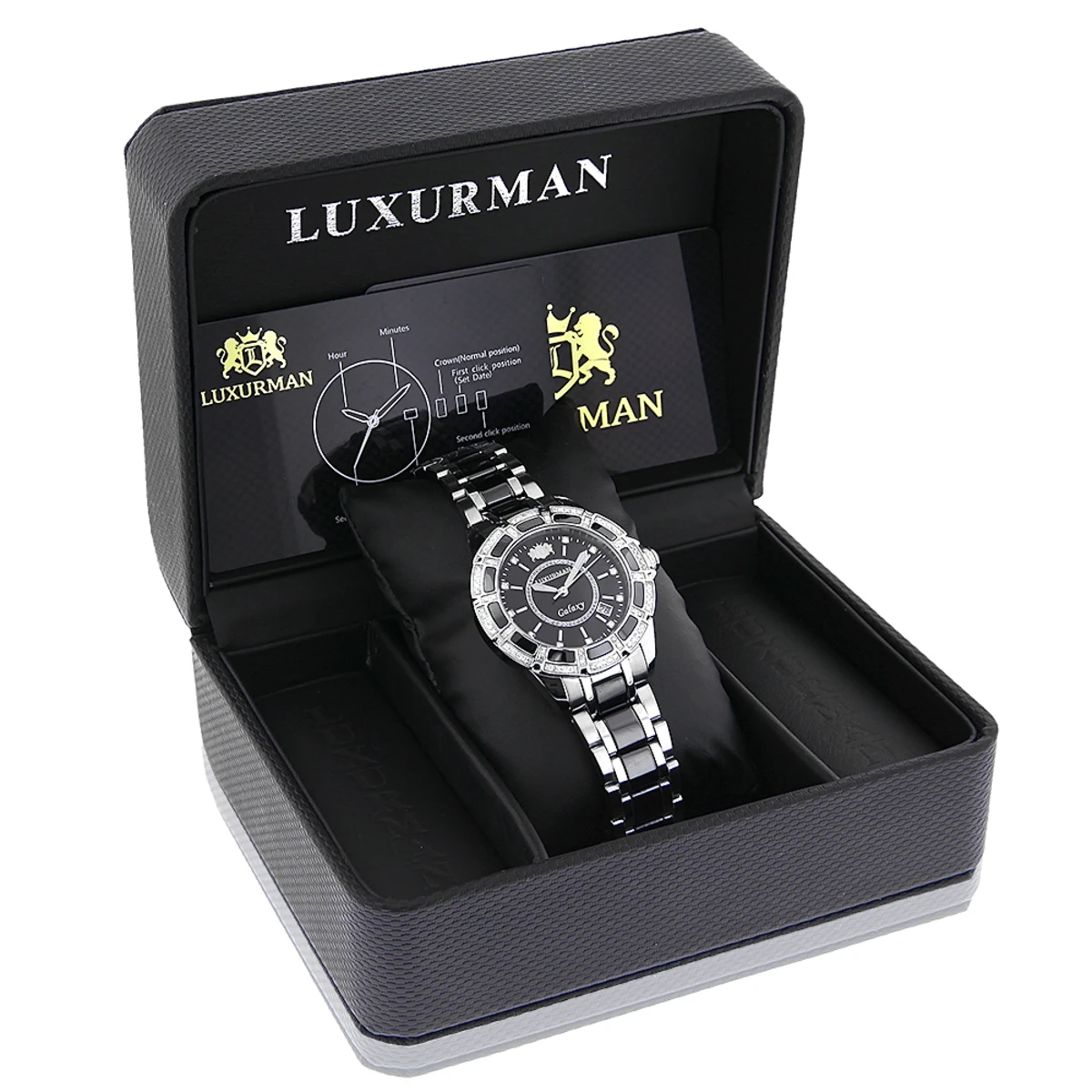 This Luxurman Galaxy Midsize Diamond Watch Black Ceramic showcases 1.25 carats of genuine diamonds. This unisex Luxurman watch is made with 18K white gold plated stainless steel and black ceramic, featuring a precise Swiss made movement, this sleek and quality made Galaxy watch comes with a 5 years manufacturers warranty! This stylish Luxurman watch is water resistant to 3 ATM and can be worn by both men an women.