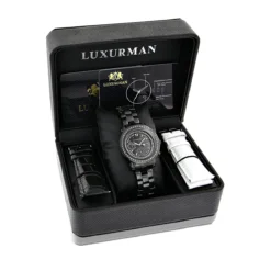 Unique Luxurman Watches: This Ladies Black Diamond Watch showcases 2.15 carats of sparkling diamonds. This Luxurman diamond watch features a black mother of pearl dial with 1 row of sparkling stones and three subdials, a black tone stainless steel case and a polished black tone stainless steel band. This Ladies diamond wrist watch by LUXURMAN houses a fine Japan-made quartz movement, and is conveniently water-resistant.